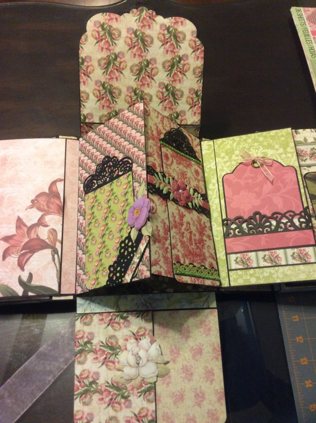 First I built up the album using black chipboard, which I covered with black cardstock. And since this was just an experiment, I actually used black duck tape to tape them together. Four panels of 9″x7″, one 9″x3″, and two 9″x1″. In retrospect, the thinner panels should’ve been 1.5″ wide, because as things were added it was getting kinda fat!