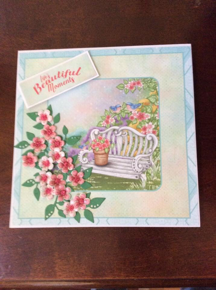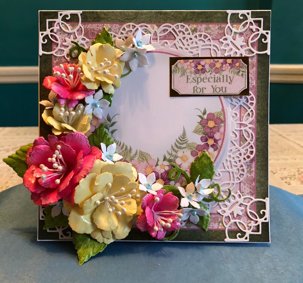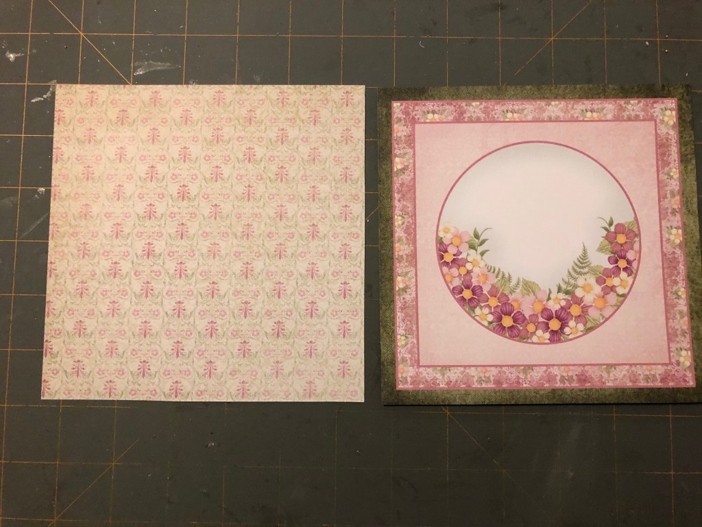 For this card, you will need a piece of 6” x 12” white cardstock, scored along the long side at 6”, to make a 6” x 6” square card base. Your designer papers should be cut to 5-7/8” x 5-7/8” to allow for a white border. I used Heartfelt Creations Wild Roses paper.