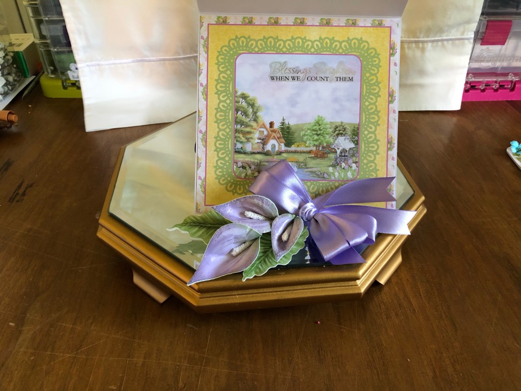I cut the center circle out with my old Creative Memories circle cutter, placed dimensional foam on the reverse of my circle cut out, and then centered it on the doily. Then I glued the doily on the designer paper, centered, of course. I added the corner lacy pieces next, and then using flowers crafted from Heartfelt Creations Small Wild Rose die, I used hot glue to adhere them around the bottom left of the circle. Lastly, I added a sentiment from the paper pack, placed on shiny gold cardstock.