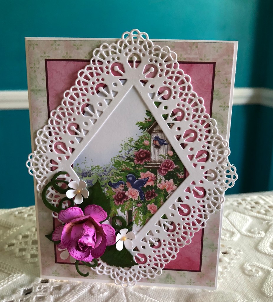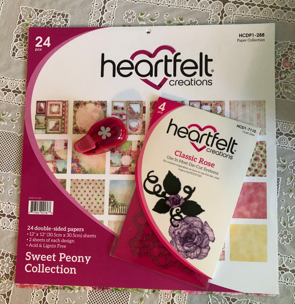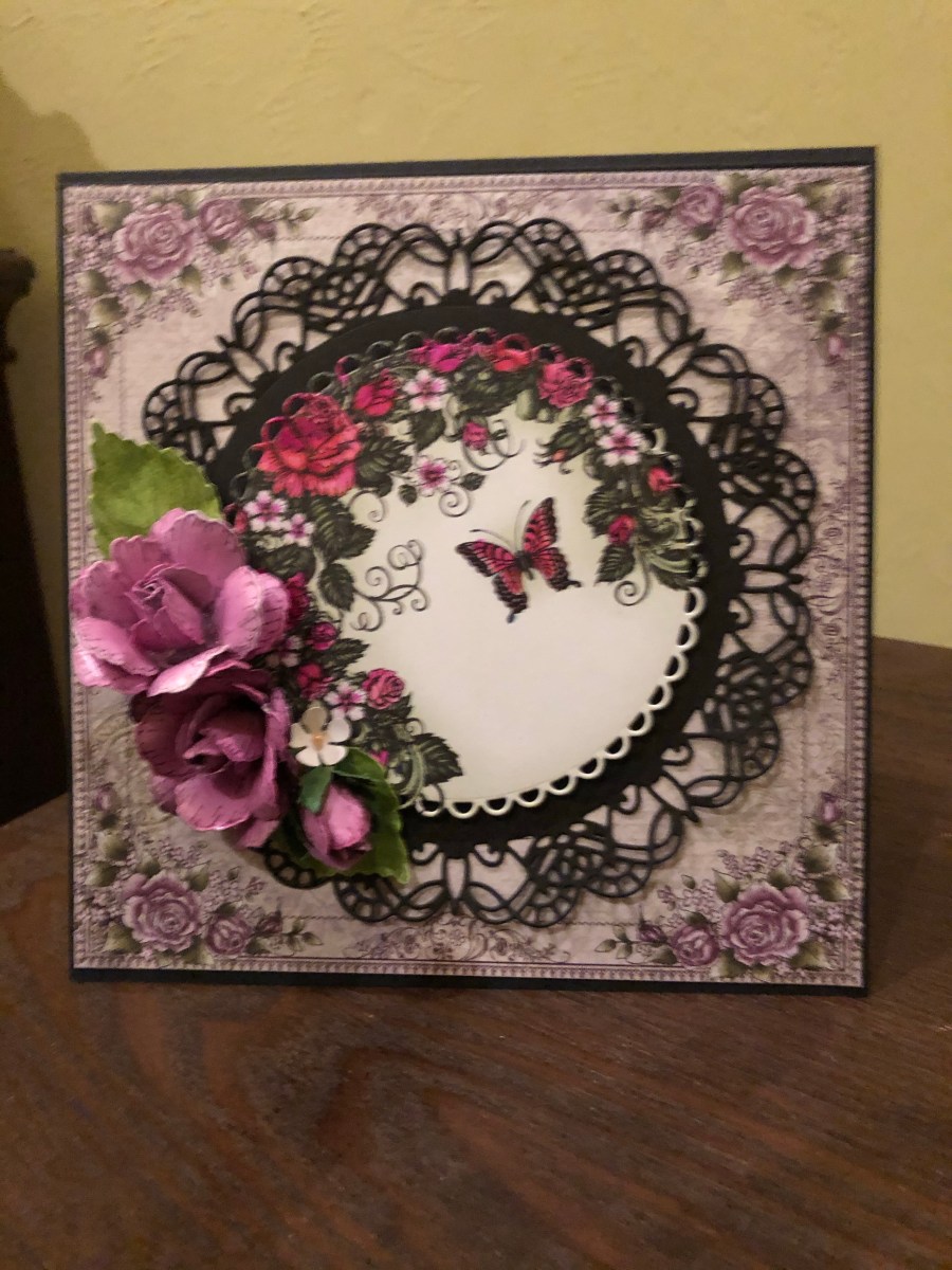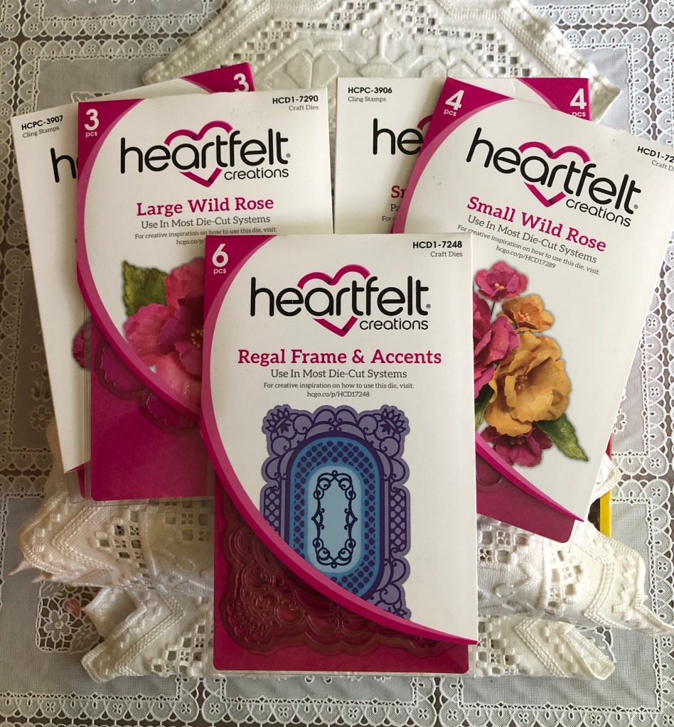 It’s amazing what you can create with scraps!! This card is created using Heartfelt Creations Classic Rose paper, I actually had to color the flowers and butterfly, as they just weren’t the right color, and I didn’t have any other scraps that would do. The dimensional flowers were created using the Wild Rose stamp and die set, the white blossom is from an old punch with a single prill in the centers.