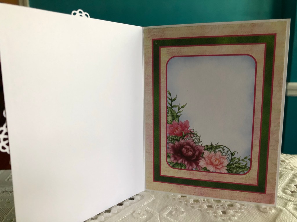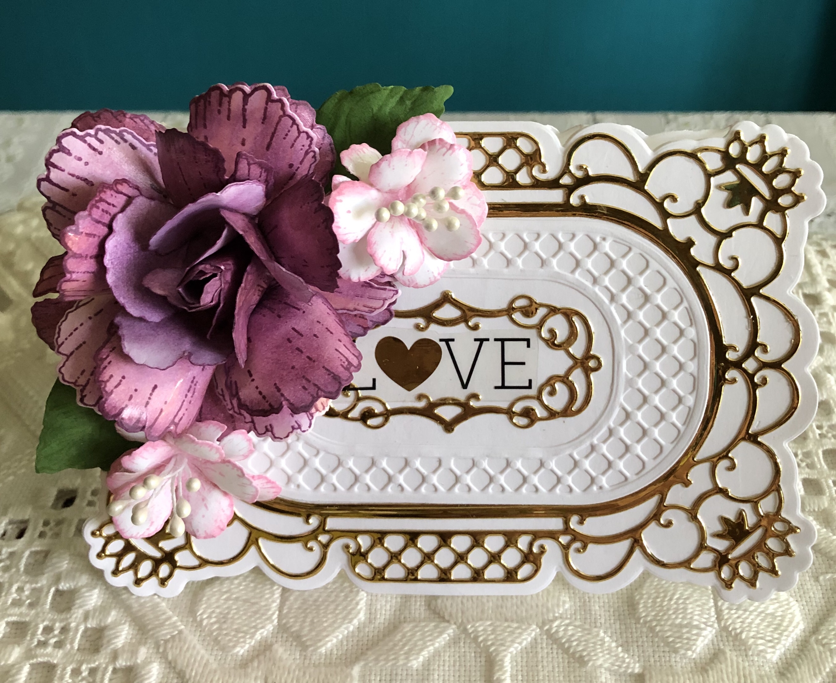 For this week I have a classic 5 x 7” card base with an elegant gold frame, a rose and a couple of smaller blossom. Since I had pre-made the flowers, it went together fairly quickly, I just had to die cut the gold and white overlays, and glue things together.
