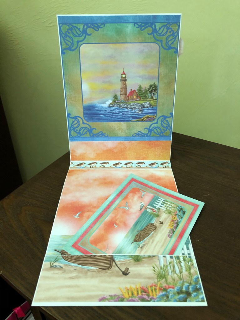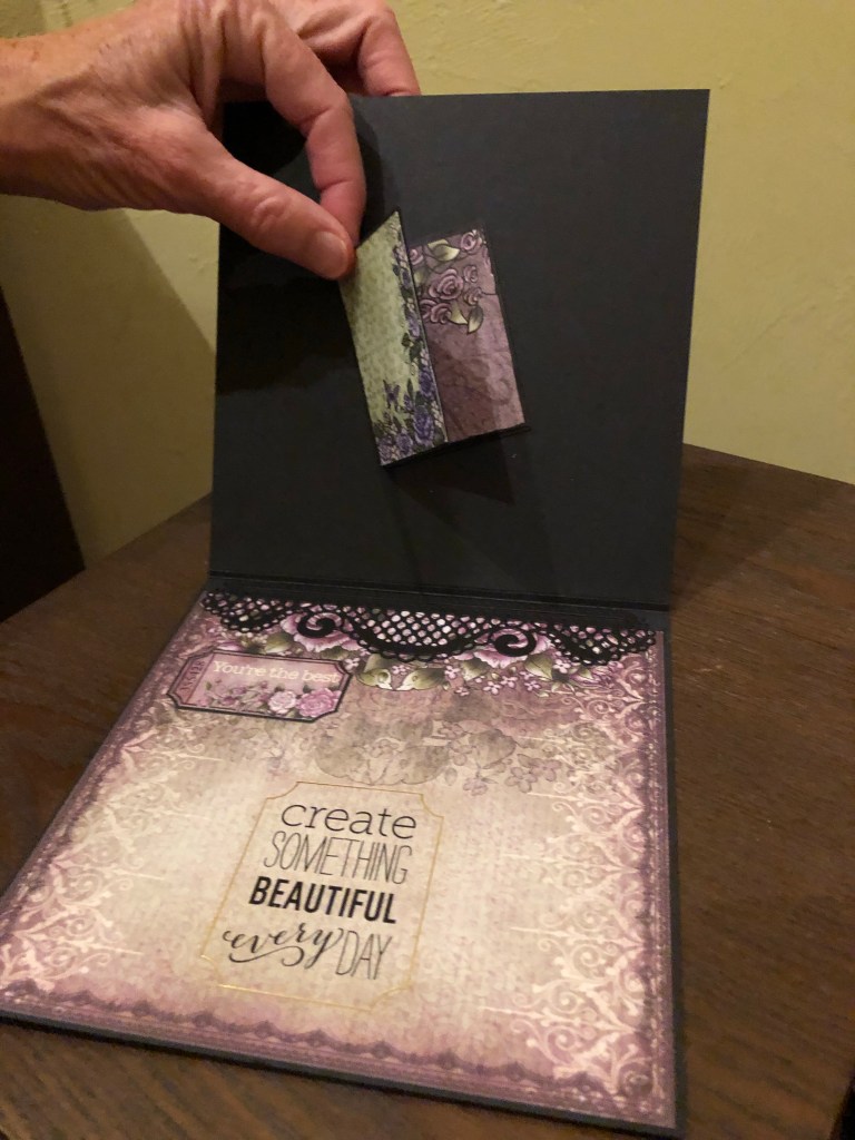 The inside has a little pocket with a tag. I didn’t put in any sentiments yet, because I’m not sure for whom this card is intended, nor what the occasion will be. (Probably not a sympathy card though.) However, I will have a cute little sentiment stamped in the center of the back panel, and a cut piece from the paper pack to put on back of the little tag.