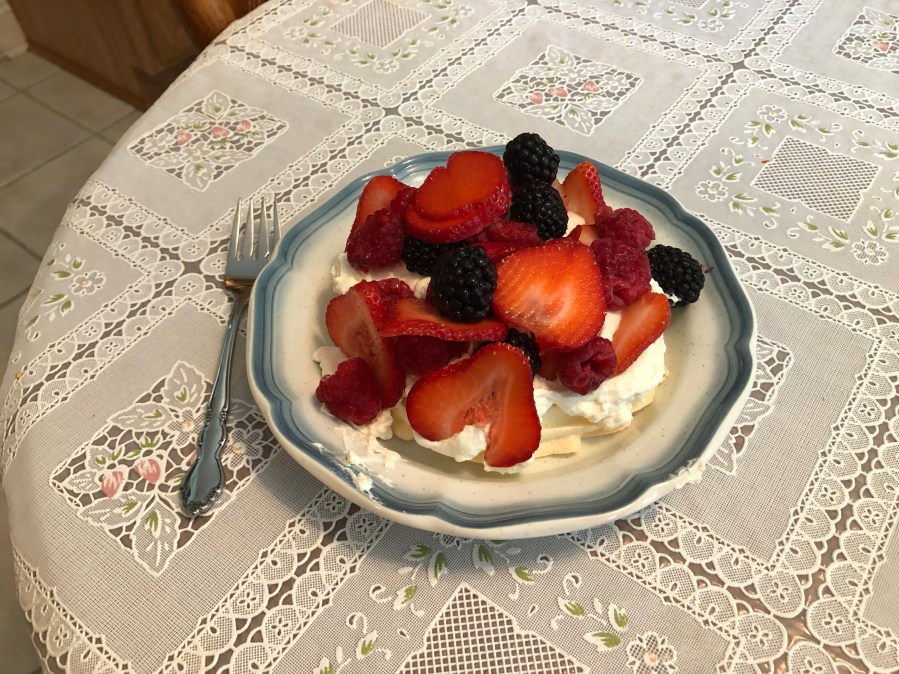 When you’re ready to serve the Pavlovas, lift them off the parchment with a wide spatula, and place them on a plate. Put a very generous amount of your sugar-free pudding all over the top, and then drop your favorite berries on top of the pudding. My choice was blackberries, raspberries, and crushed strawberries. You could also add blueberries, or even go with mangoes and peaches!