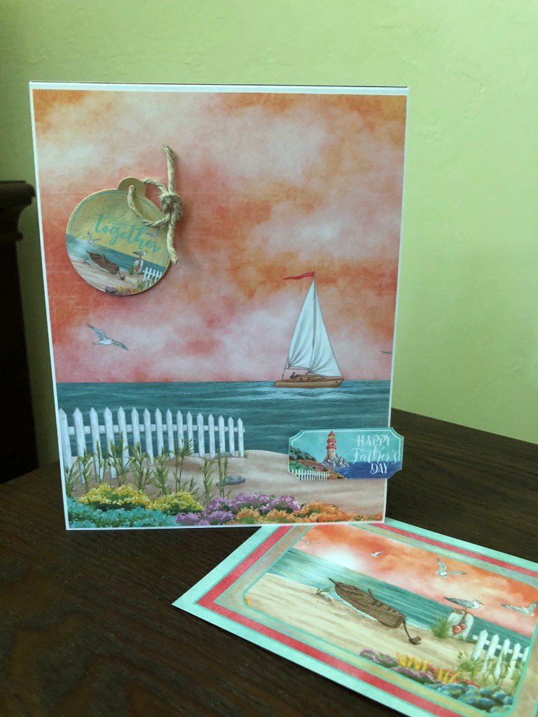 So, start off by cutting yourself a piece of white cardstock, measuring 12” x 6”. Fold in half to give yourself a 6” square, With the fold on the left side, fold the right edge of the top in half towards the fold (3” x 6”). Now select your papers. You can select one of their 6” x 6” scenes like I did, but then you will need to trim it down so that it measures about 5-7/8” square. This goes on the back inside. You will need two pieces measuring 2-7/8” x 5-7/8” for the front and inside fold. Then select your center panel from the designer paper measuring 4” x 6”, and mount it on white cardstock, so that it has a bit of a white border. Center it on the front, making sure to only glue it to that front 3” x 6” folded piece. For the pocket, take some white cardstock measuring about 2-7/8” wide by 2” tall or more, and use the lace edge die from the album tags and accents set of dies. Cut your tag from the paper, and trim it down as needed – mount this also on white cardstock, punch the hole on top of the tag and slip in a ribbon if desired. The medium wild rose and three smaller ones with about 6 leaves complete your look.