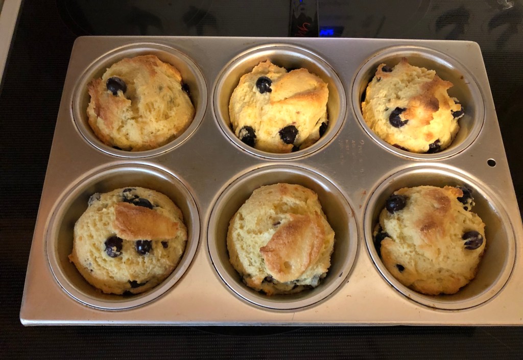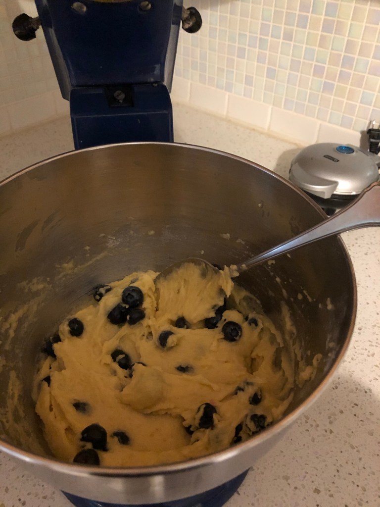 4 EB XL eggs 3/4 cup almond flour & 1/4 cup all-purpose flour 1/2 cup Monk Fruit 2 Tablespoons Coconut Oil 1-1/2 tsp Xanthen Gum 1 tsp Baking Powder 1/4 tsp salt 1 tsp real vanilla extract 1-1/2 cups clean & dry Blueberries