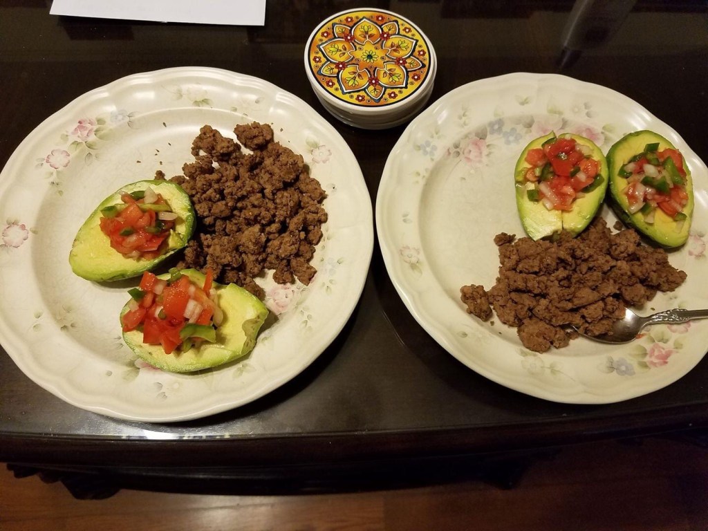 The only thing missing here, are the chips! You can add sour cream, shredded cheese and salsa to your hearts content! We have ground beef, seasoned for tacos, avocado halves, and homemade Pico de Gallo. Delicious and filling, and carb count is near zero! Yum, I’m going back for more!