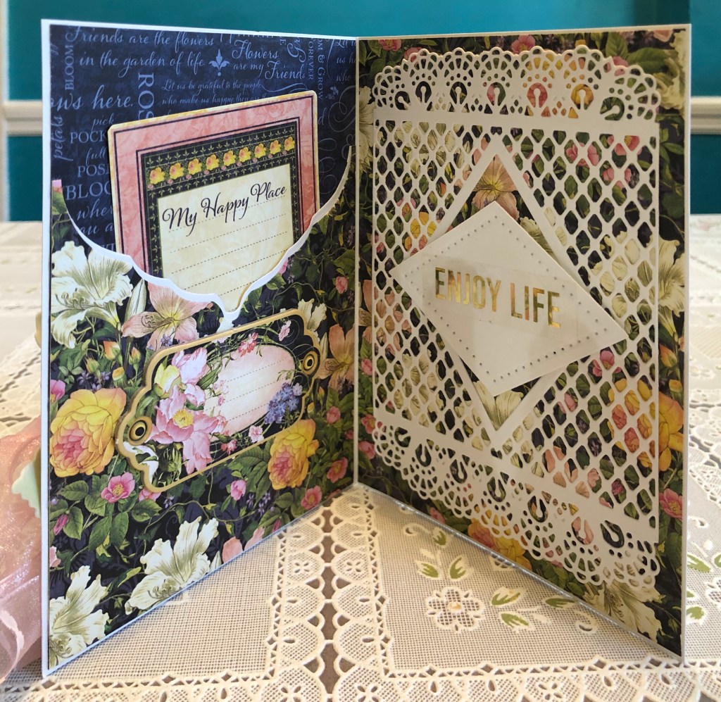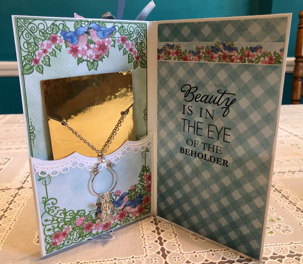 This is a “fomiron” wild rose, very large and yet delicate at the same time.A little bling along the side, along with fabric lace to offset the small wild cherry flowers in the top corner.The necklace was made from elements found at “Michaels”. The pocket is actually gusseted to allow room for the rest of the necklace chain inside the pocket. Not a very flat card, although I was hoping it would be, I will still not be too worried about mailing it. The cherry blossom won’t be totally ruined if they are a little smashed by our postal service.