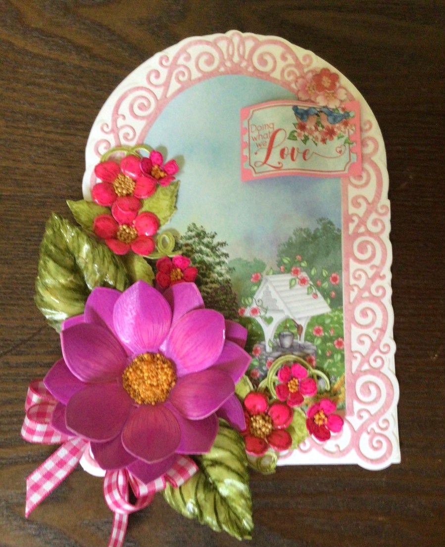 A Valentines card for my Sweetie using Heartfelt Creations new “gateway” dies, a few blossom, and swans from their Calla Lily paper collection. I added a bit of glitter to the swans on the front, probably overdid it!