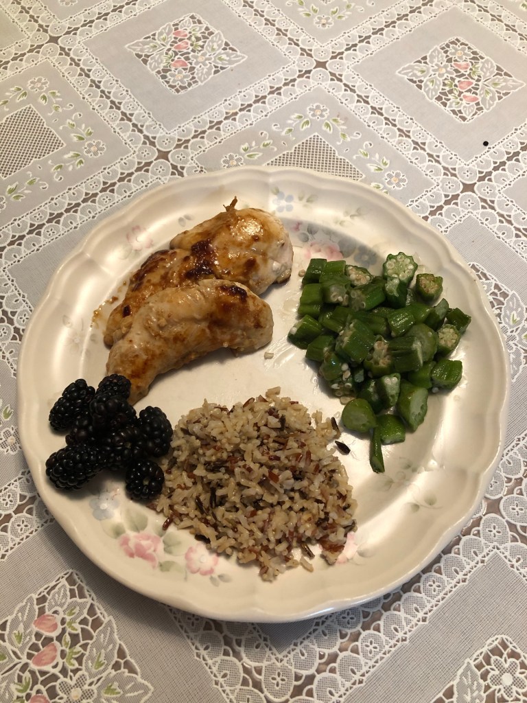 The okra is a keto standby for us, again, easily sautéed in the skillet while cooking the chicken and rice.