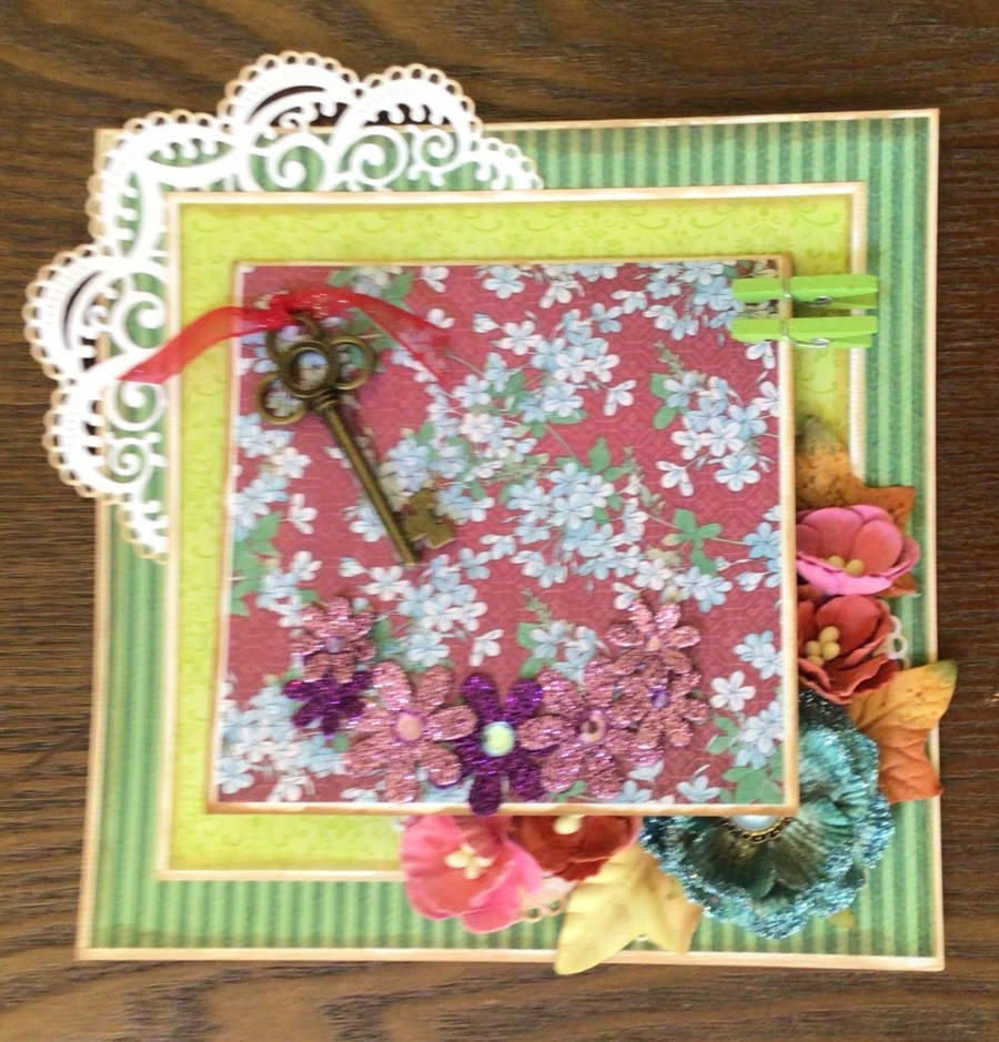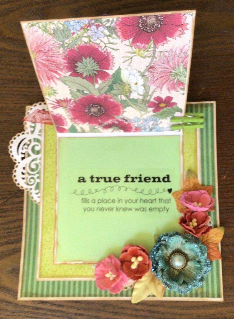 This is a little off my usual, especially as I used flowers from my stash, that I bought, long ago before I learned how to make my own. Anyway, it’s a take off of something I must’ve seen somewhere, using Graphic 45 “Bloom” papers. Beneath the green stripes there is an “inside” as well, for a more personal message.
