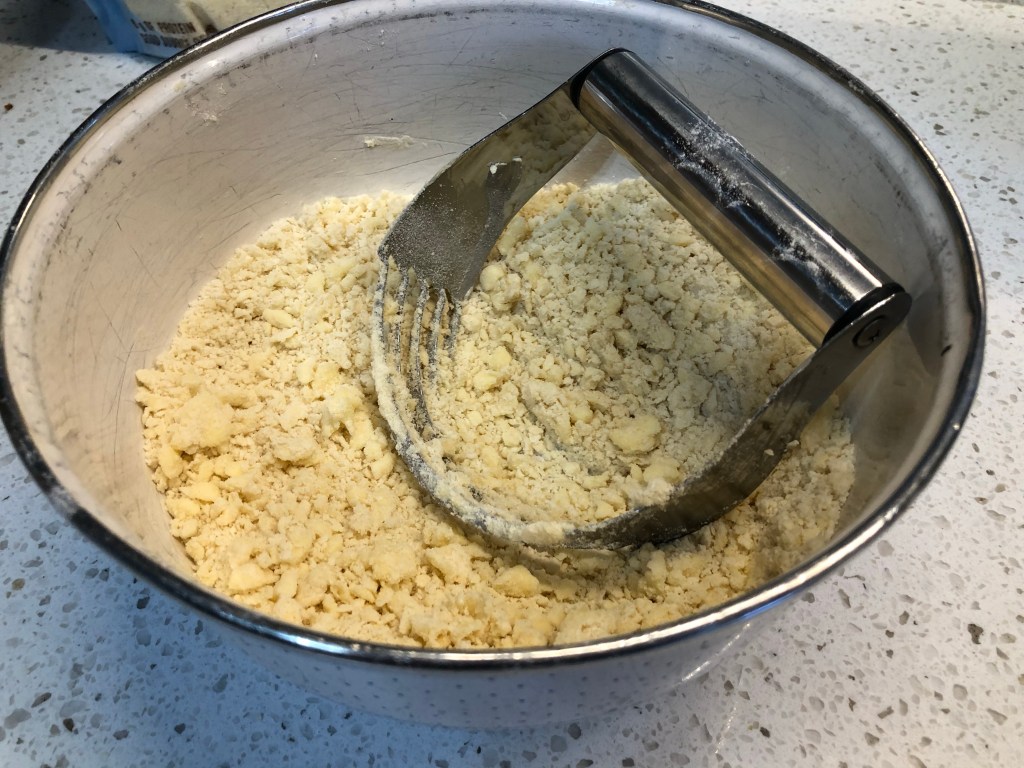 Cut the Crisco into the flour, salt, and baking powder until crumbly.