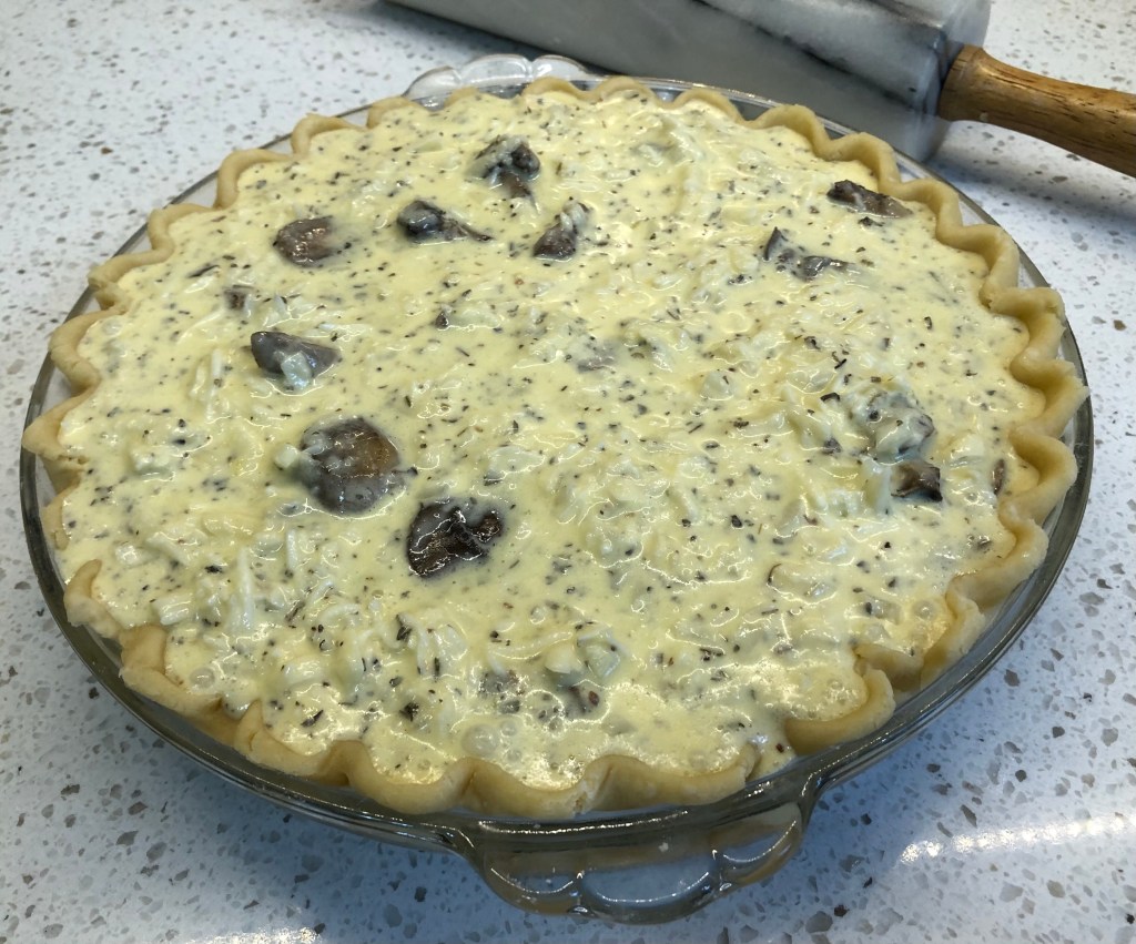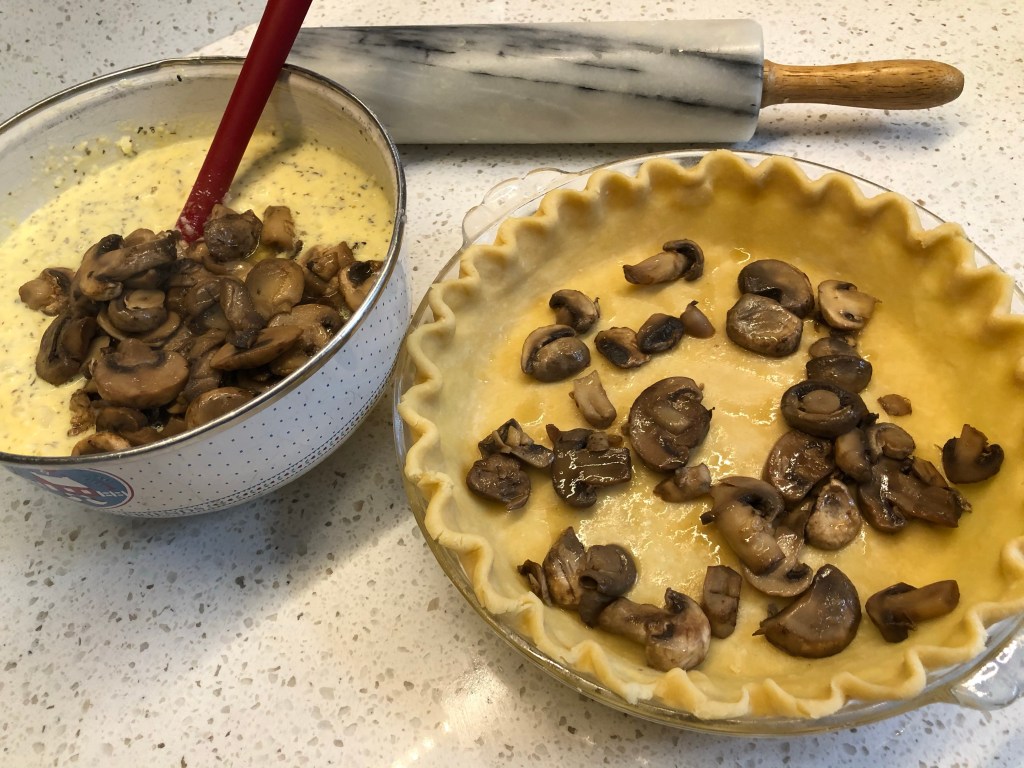 8-10 oz fresh sliced mushrooms, broiled or boiled in 1/2 cup butter (add these last, and put a few directly on the base of your pie plate or crust.