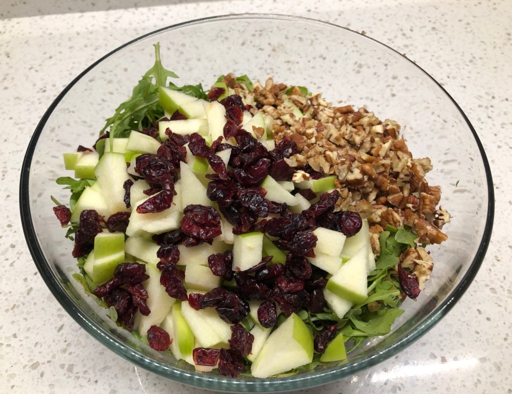 Sprinkle 1/4 tsp Red Pepper (ground) and 1/2 tsp Cinnamon (ground) over the dry Arugula, and toss well, very well. Next take a medium-large Granny Smith apple, and chop it up into bite size pieces. Chop 1/2 cup of your favorite nuts, I pick pecans! Toss in 1/3 cup Craisens