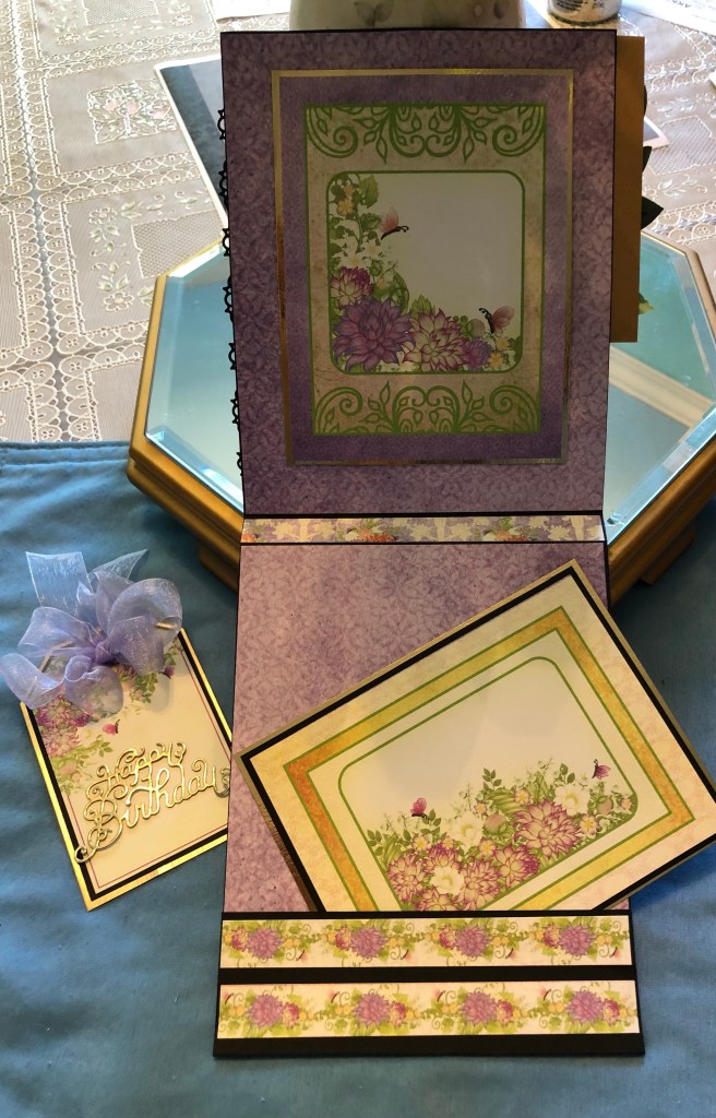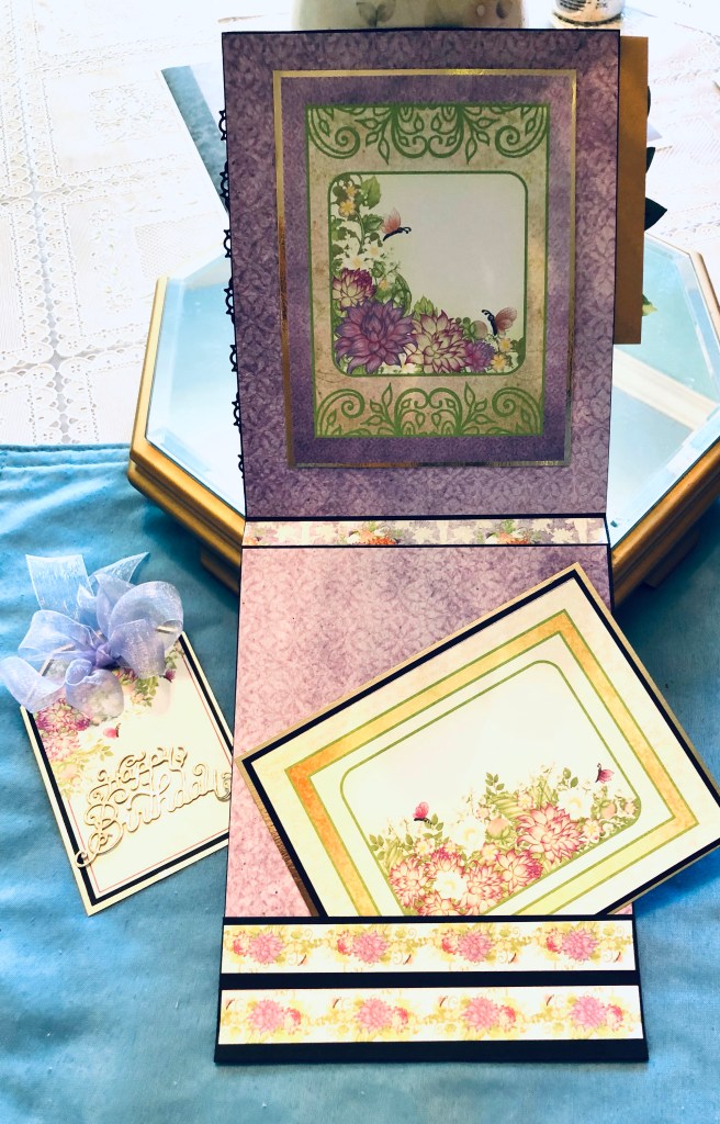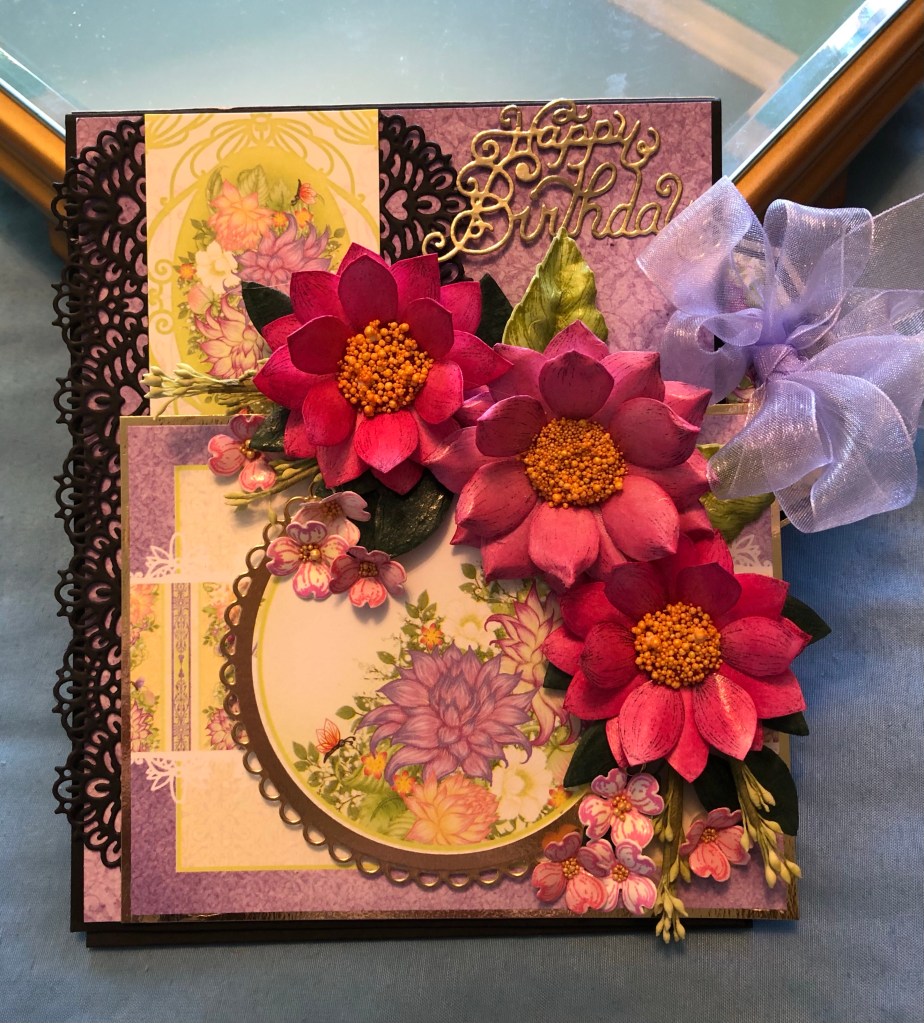 The second card is a tri-fold, and has a lot of components, including not just the candy bar, but also a little booklet and three smaller tags, which can be decorative, or used for photos or a message to the recipient. I really love this card, as I was really in a slump, but putting all the components together, helped me get motivated again. And dahlias are just plain gorgeous!