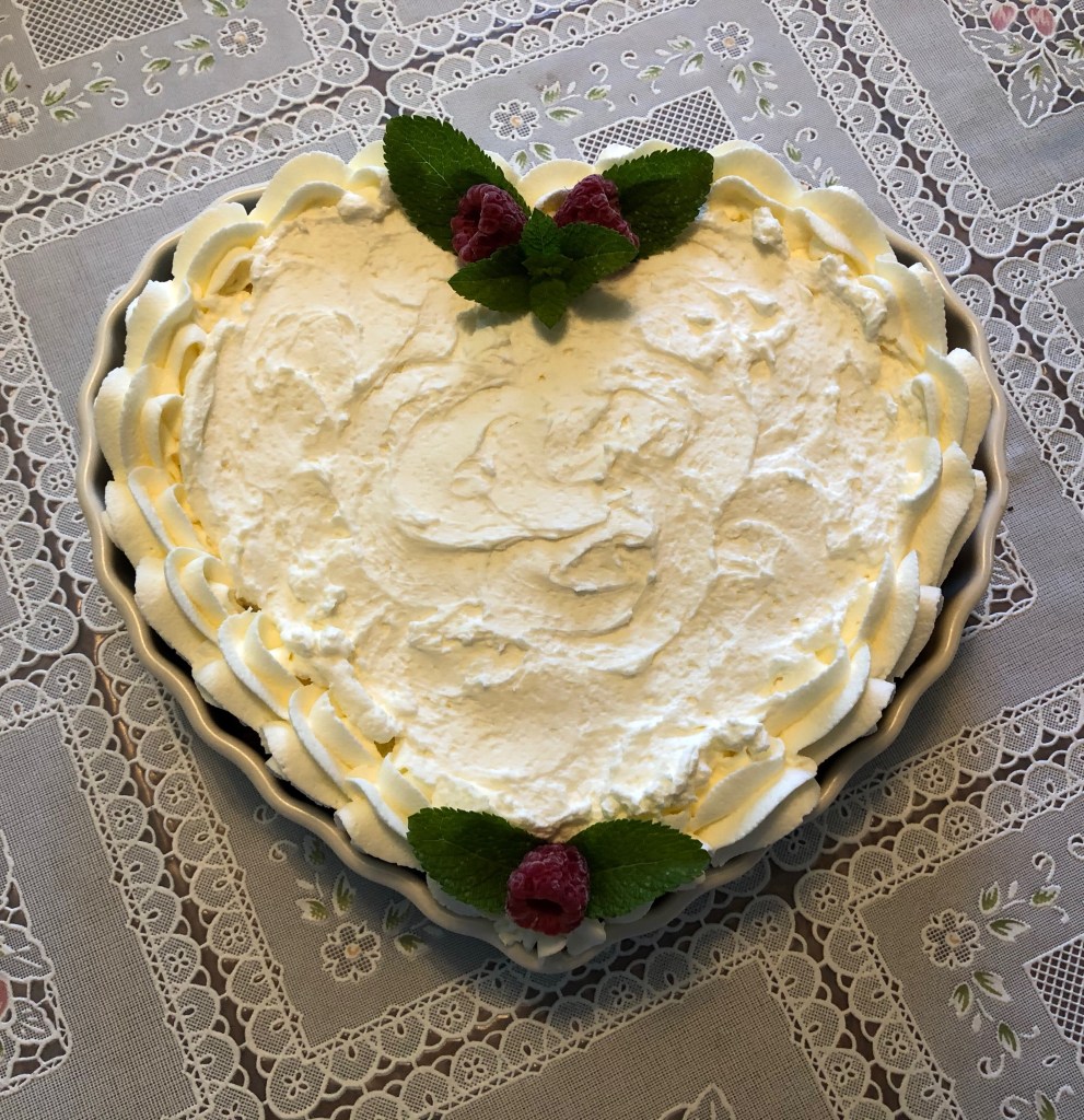 Once the cake is cooled (I squished my warm cake into this heart shaped pan, so that when cooled, it will retain the heart shape) prepare some sugar-free instant pudding with 2 cups cream, and 1/2 cup milk. Spread over the top, and decorate as desired.