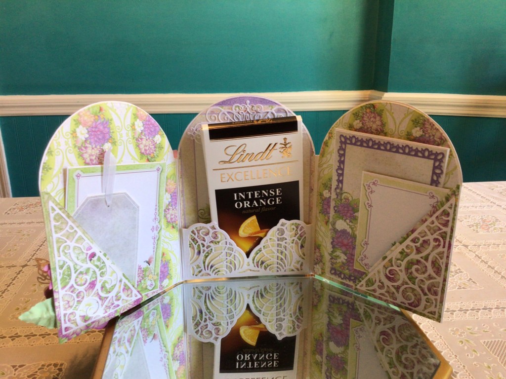 The inside folio has a pocket with a gusset that will allow a thin candy bar, or package of hot chocolate, or some other fancy gift or gift card.