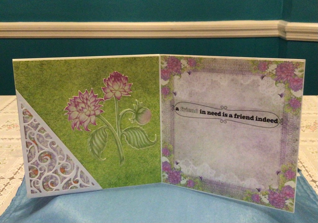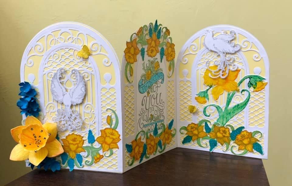 This is a tri-fold card that I sent to my sweet mother-in-law, who is 88 years young! I’ve used HFC gateway dies, and their beautiful daffodil collection. The blue are supposed to be hyacinths….and the doves came from HFC (retired) Dogwood collection. I love these doves!
