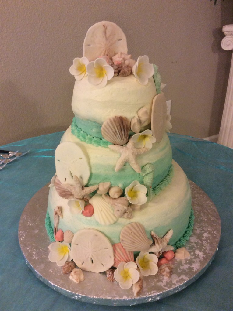 This is a Beach themed wedding cake I made for an associate at work about 4 years ago. Unfortunately, it shifted during transport, so is less than perfect.