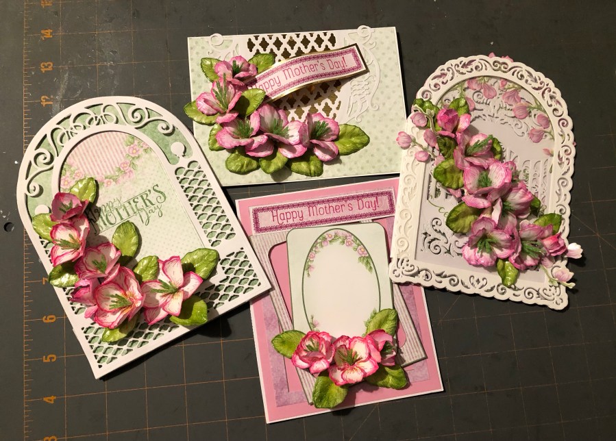 I attended a class on-line, and made four adorable Mothers Day cards, ranging in difficulty from extremely simple, to rather difficult.