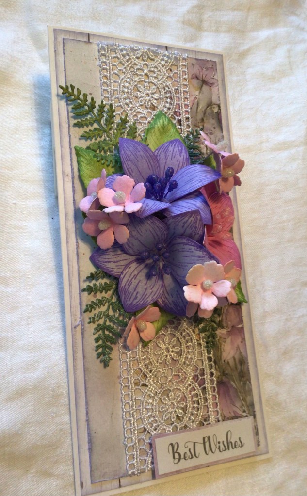 The theme at “A Place to Start” for May is Lilies and Lace. I love the beautiful artwork on Scrapandme papers! I had thought I would never get to use them, since they seem to be based in Poland, but got lucky, and found a shop in S.Carolina (Crafty City) that had a few of their collections. So this is my very first Scrapandme Card!
