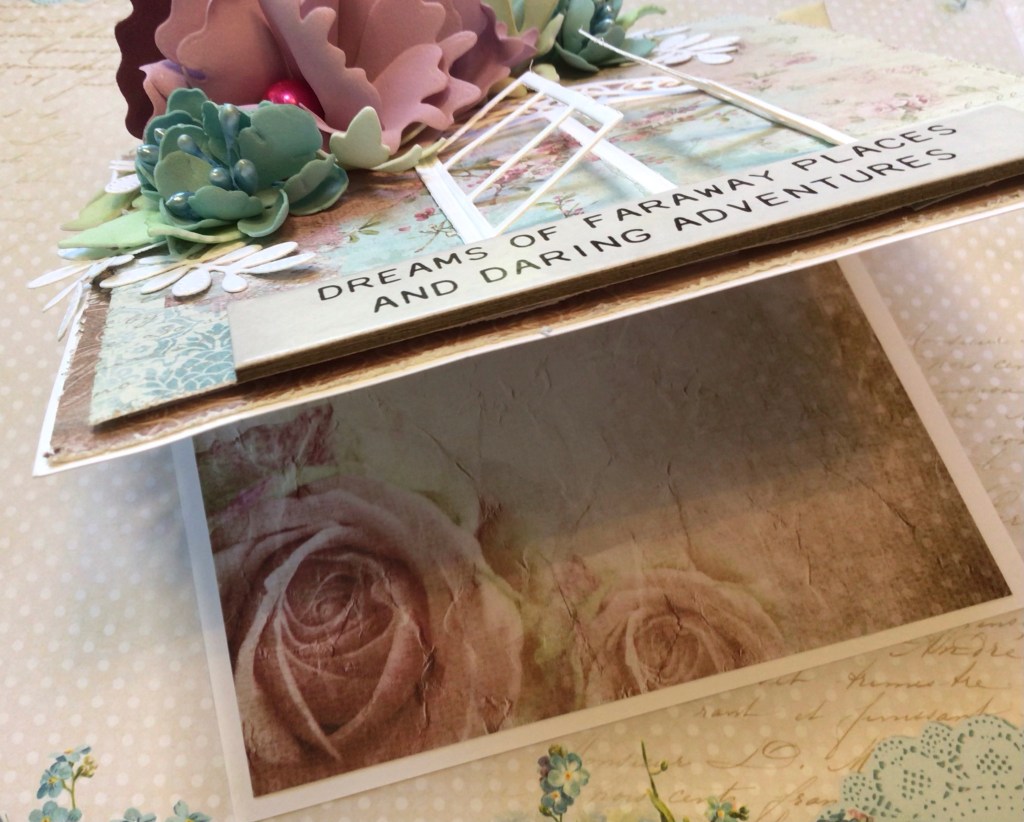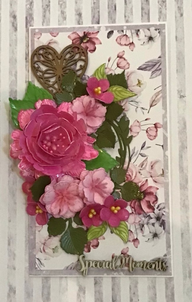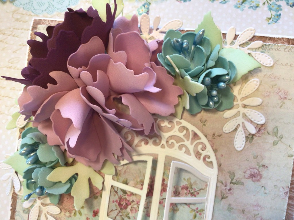 Another close look at the flowers, I’m very pleased with how it turned out, and although the fussy cut flowers (from Mintay’s Graceful papers) don’t match exactly, they do have the same color scheme & add to the dimension.
