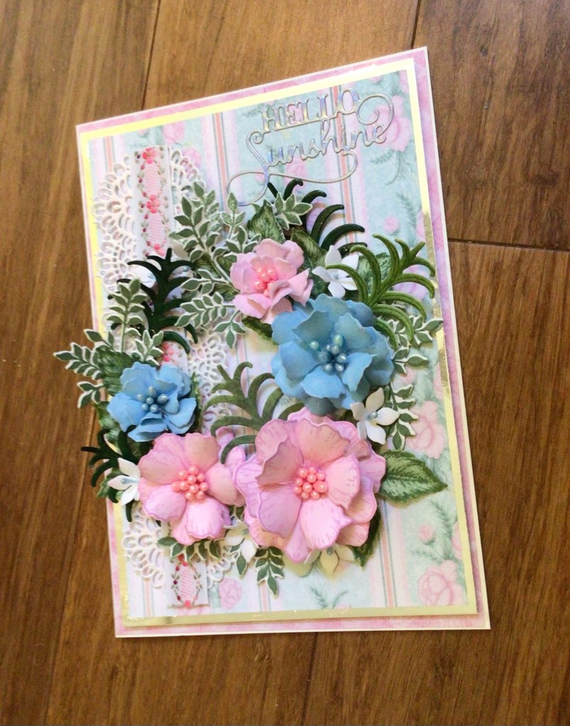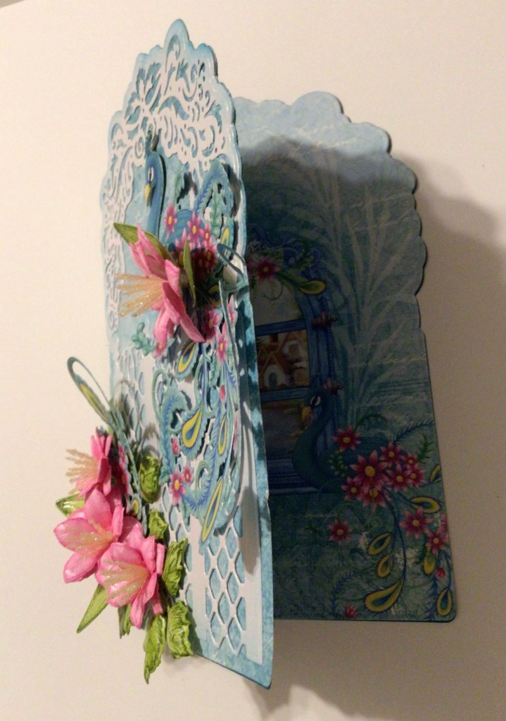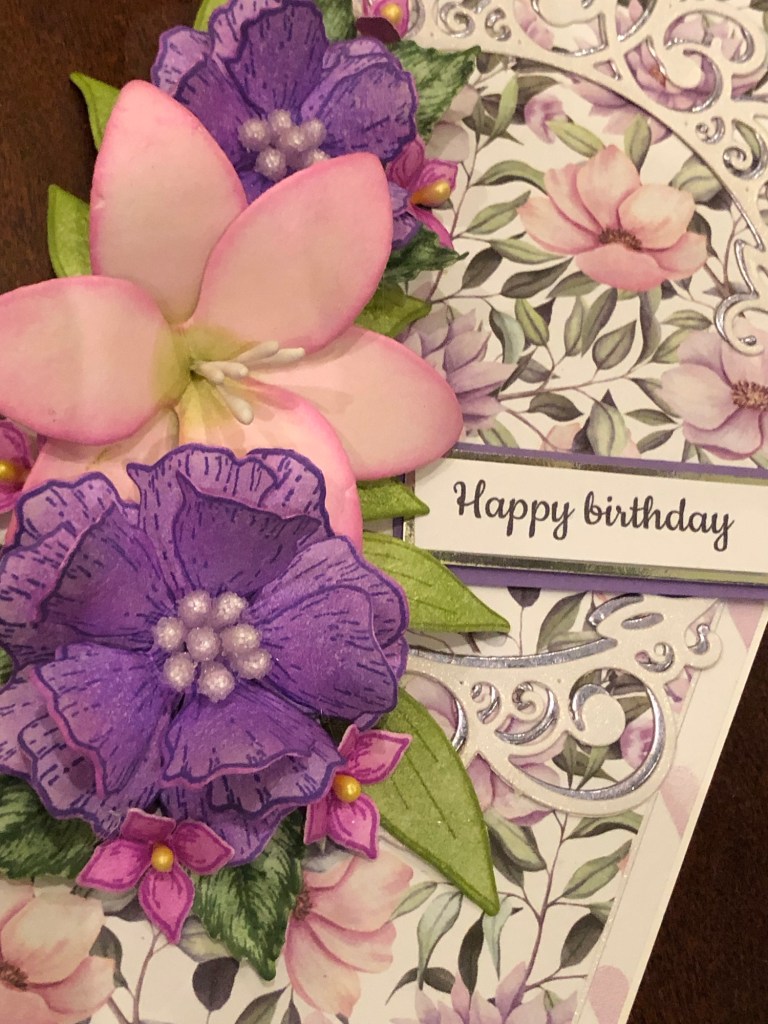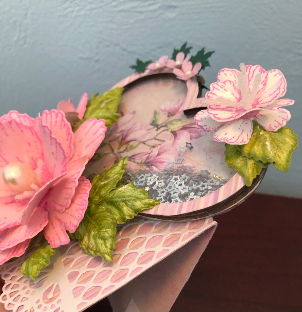 We used ScrapandMe’s paper, and a fancy heart shaped shaker box from Creative Embellishments (love that company!!) dies from Heartfelt Creations for the flowers, leaves and the the white lacy overlay, and the stamens. AND some tiny punched flowers and leaves in the corner there. This is just such fun to make, and stunning in presentation!