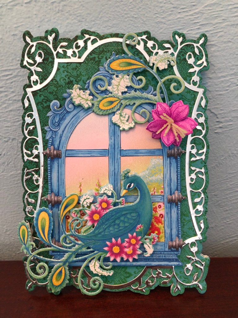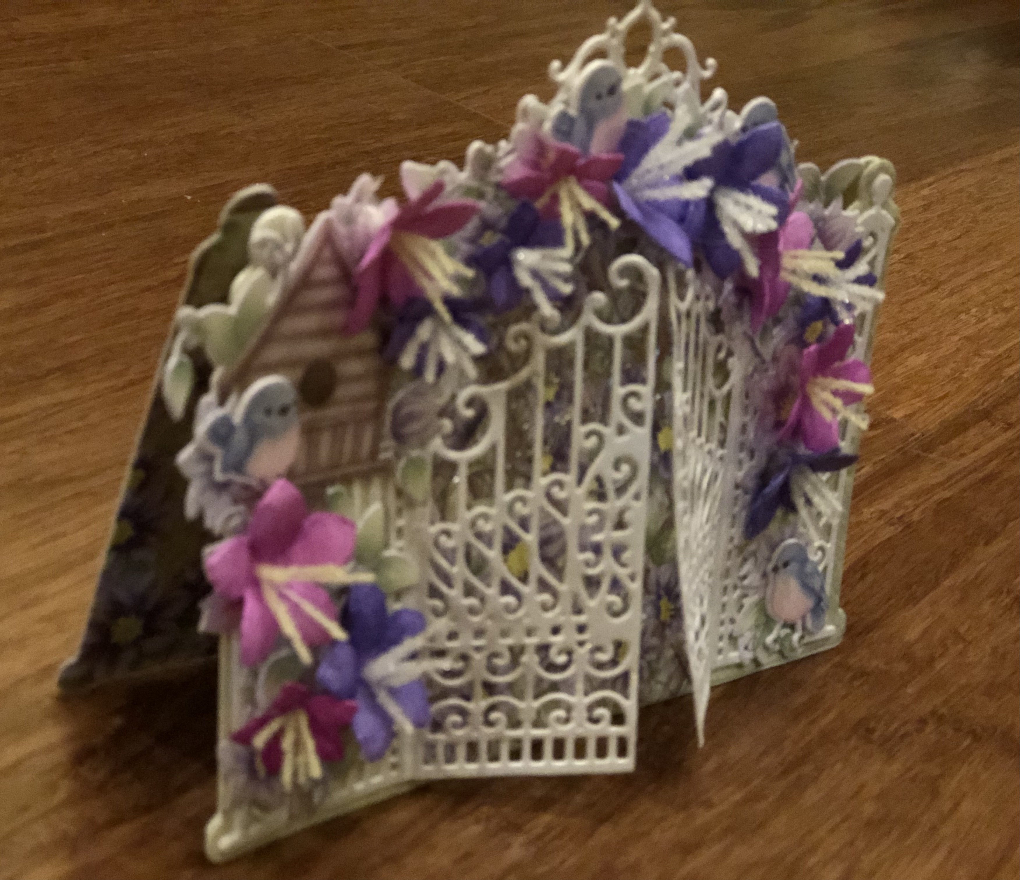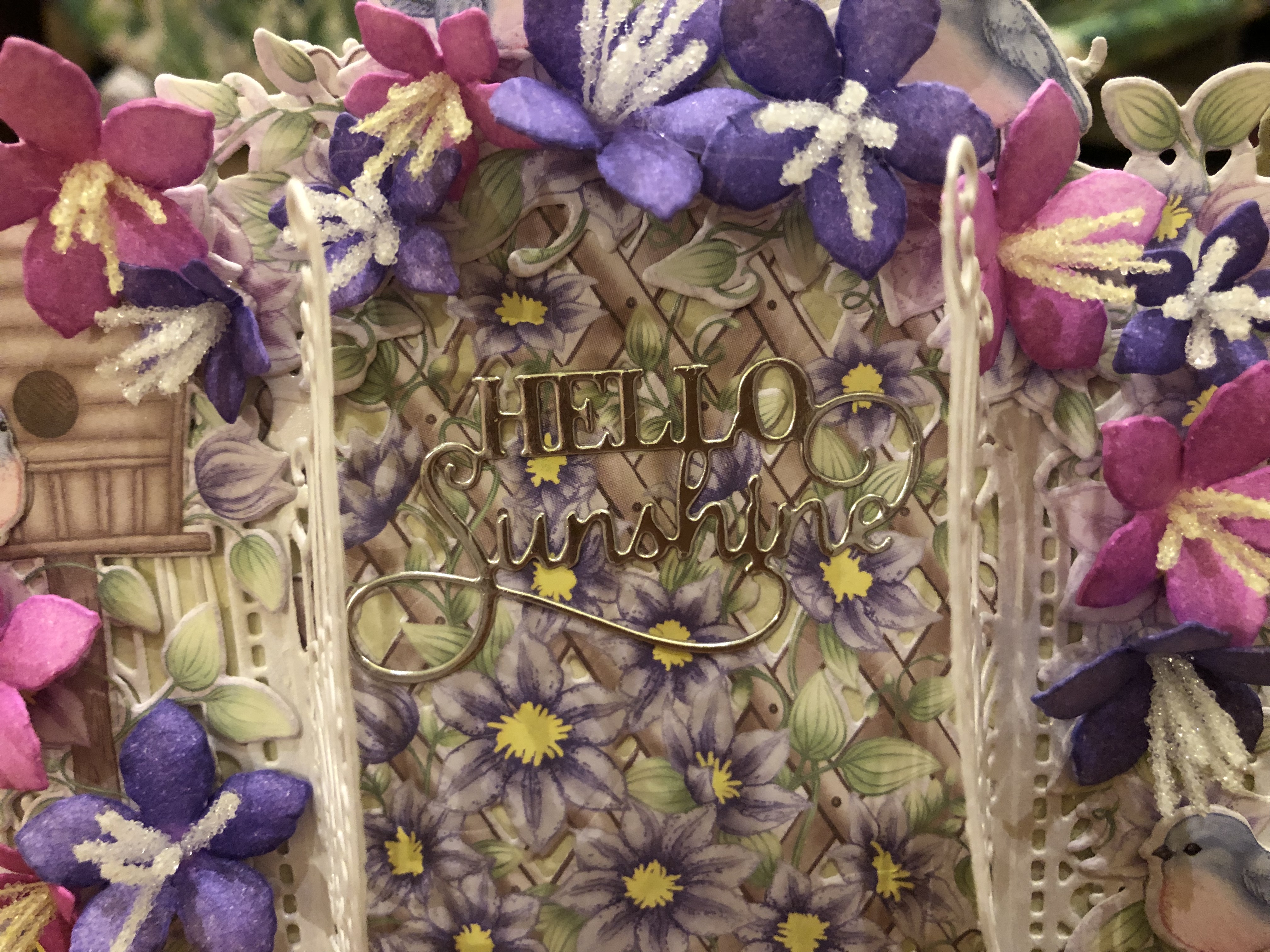 We used ScrapandMe’s paper, and a fancy heart shaped shaker box from Creative Embellishments (love that company!!) dies from Heartfelt Creations for the flowers, leaves and the the white lacy overlay, and the stamens. AND some tiny punched flowers and leaves in the corner there. This is just such fun to make, and stunning in presentation!