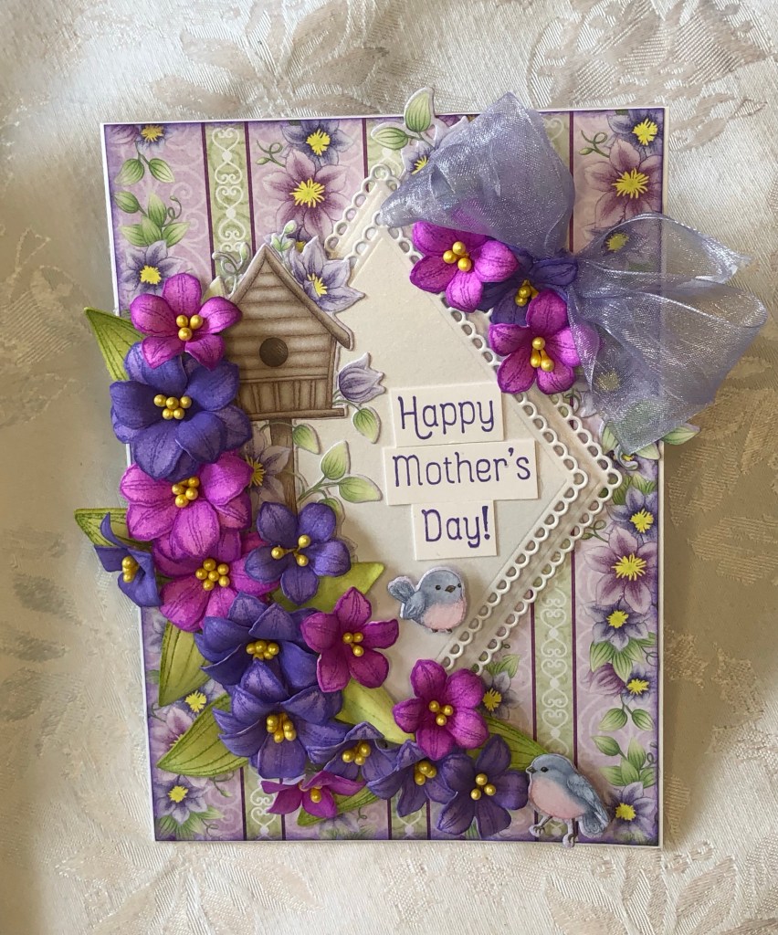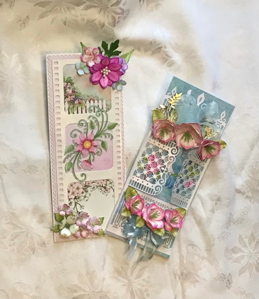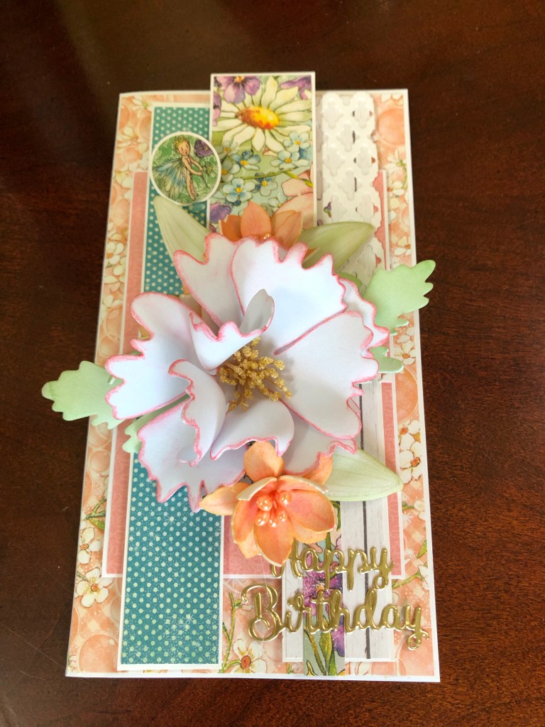 Once again, I just added a simple clematis flower in the top right hand corner. The shaped card uses one of Heartfelt Creations dies, as well, the Fancy Classic Rectangle Frame die – and I used one of the inner die cuts from it for the middle of the card. The sentiment is from Creative Expressions (I have rotten handwriting, and well, it looks better using their dies, doesn’t it!!)