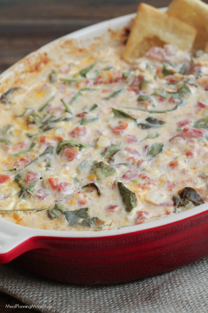 One packed of chopped spinach, defrost and drain 8 oz Cream cheese 6-8oz chunky salsa 1/2 small can of Rotel One cup shredded mozzarella cheese 2-4 Tbsps heavy cream, or Sour cream Place in crock pot on low heat, and after about 30 minutes, stir well.
