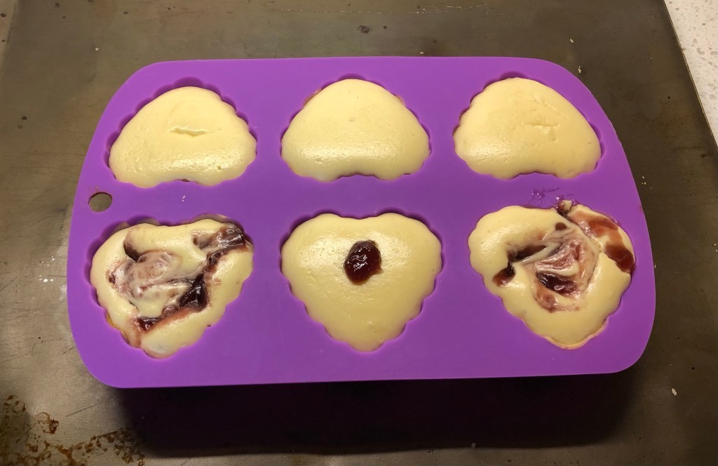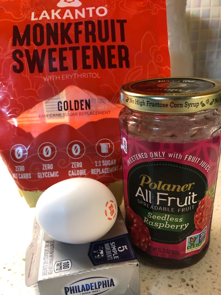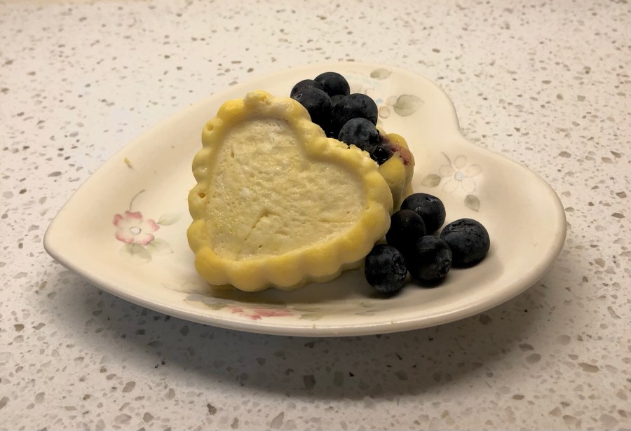 For a small pan of tartlets like I have here, you need a silicone pan, and you’ll need to spray it with Pam or some other cooking release spray. For a small batch like I’ve done here you will need: One XL Egg 8oz softened Cream Cheese 1/4cup Lakanto Monk Fruit 1/2 tsp vanilla extract Beat all the ingredients well, so it is smooth as silk, and then divide into the cupcake pan as shown. If you would like to add some fruit to it, melt down some sugar-free jam, put a small teaspoon in the center of the batter, and swirl it around with a spoon. Bake at 300° F for about 45 minutes. Let them cool for quite a while before trying to remove from the pan.