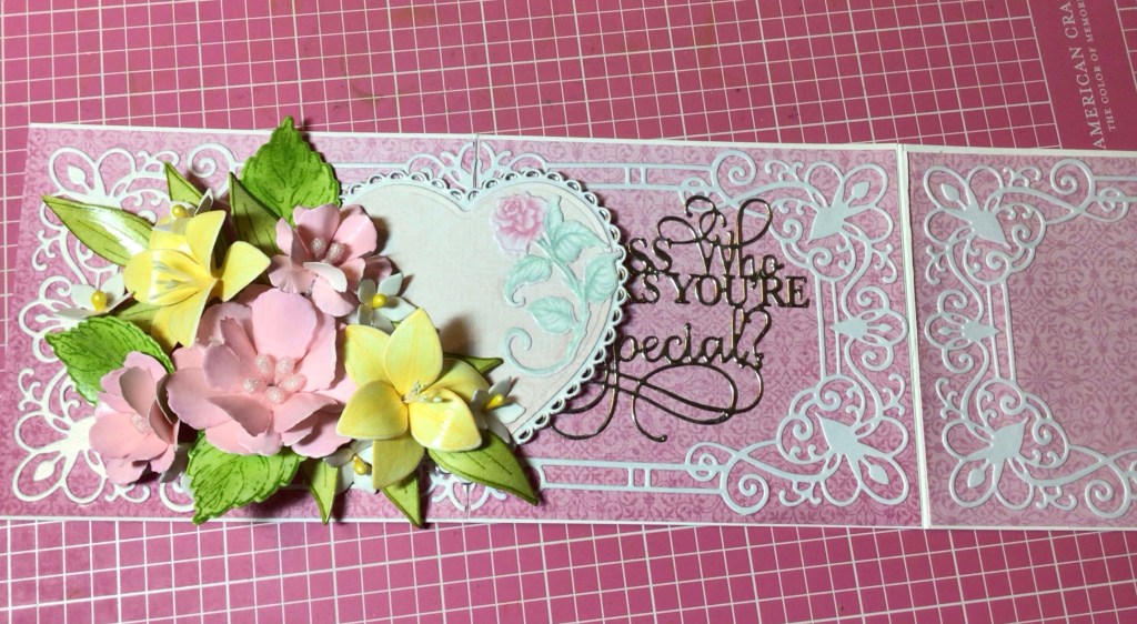I’ve been on a kick using up scraps. I have so many!! This paper is using Graphic 45’s “Grow with Love” collection. It has beautiful artwork (as usual!) and is perfect for Springtime, Mothers Day and/or Easter. If we are lucky, perhaps Graphic 45 will re-release it with a die in a Collectors pack, in the near future!!