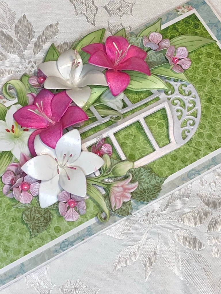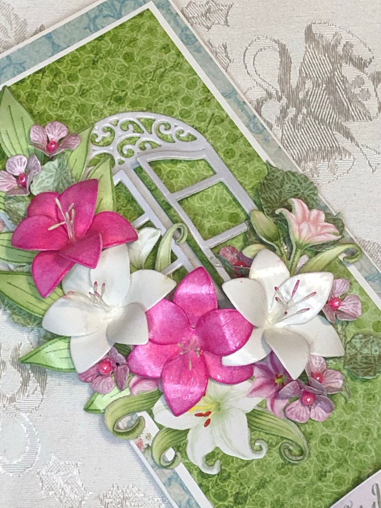 I used a Spellbinders die for the lacy center piece (and the corners on the inside) and my favorite flowers from Heartfelt Creations, the Classic Rose, Garden Lily, and some Lilacs.