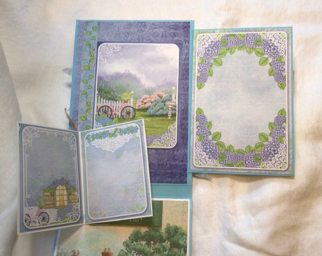 I saw a post by a lady on Facebook, using Heartfelt Creations paper and dies to make a tie-fold card (Kirsten Muehlen). It was adorable!! Anyway it got me going on a roll, and I have here, 5 little tri-fold cards made from 5 different Heartfelt Creations paper collections. They each measure about 4×6 when closed. The middle panel cover on all these hides a sketch pad – the nice kind meant for water coloring!