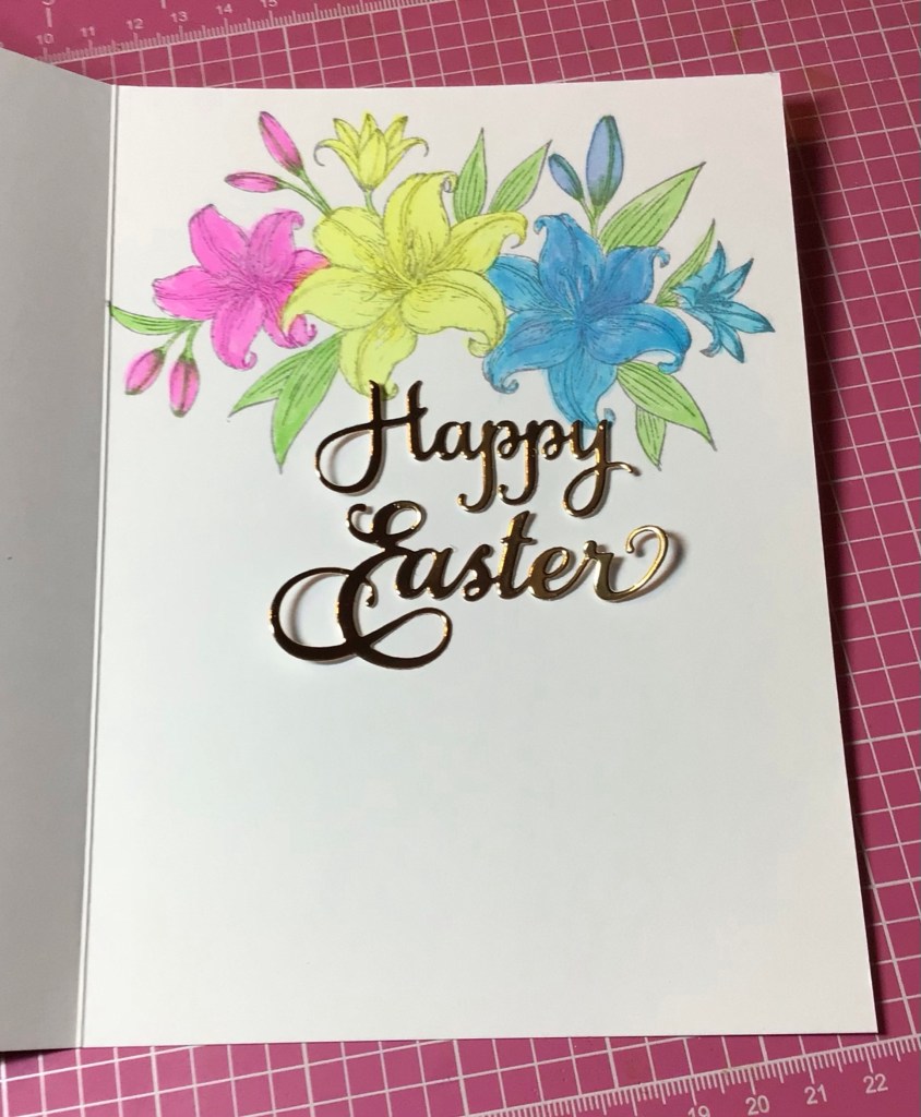 On the inside I stamped an image directly to the card, and had fun water coloring it last night. Just in time for Easter – obviously I don’t have the sentiment (from Creative Expressions) glued in yet – because I can’t decide if it’s for Easter or Mothers Day!