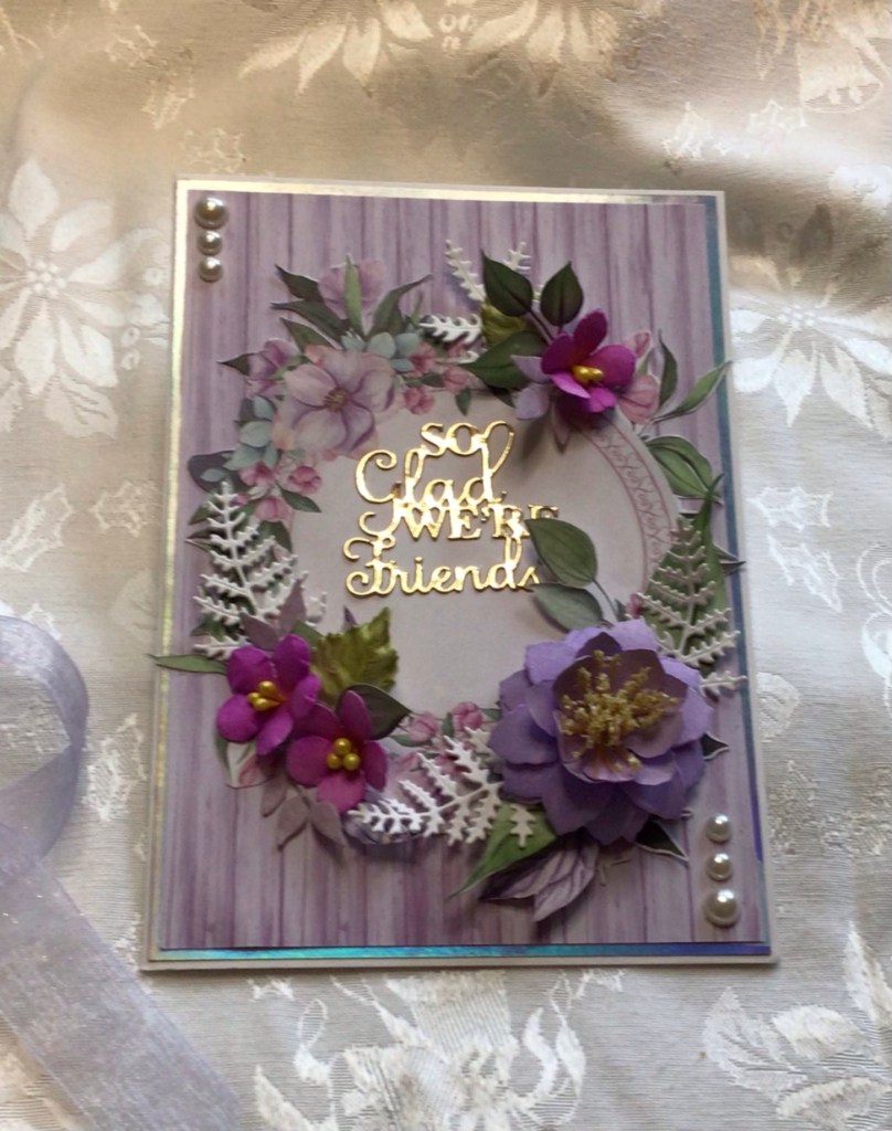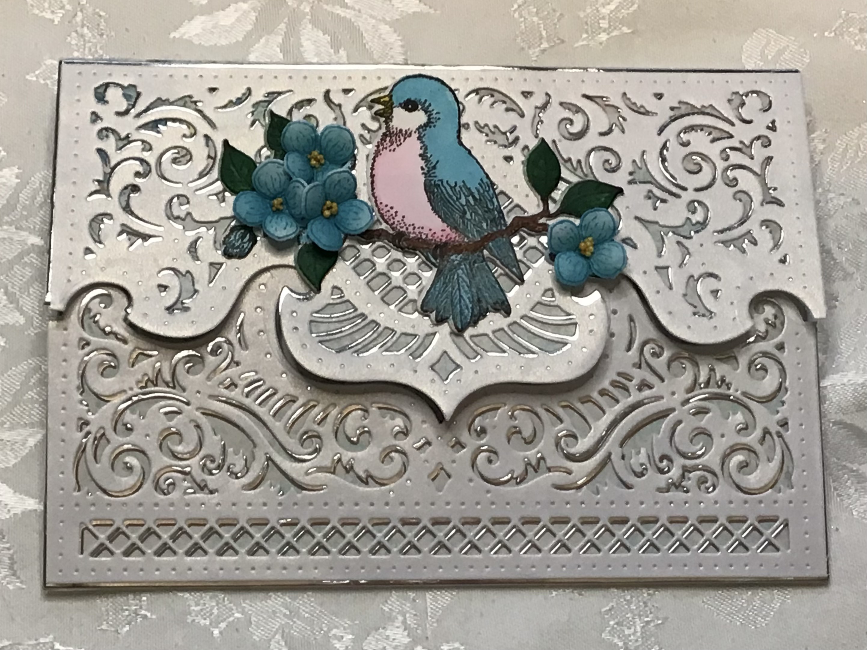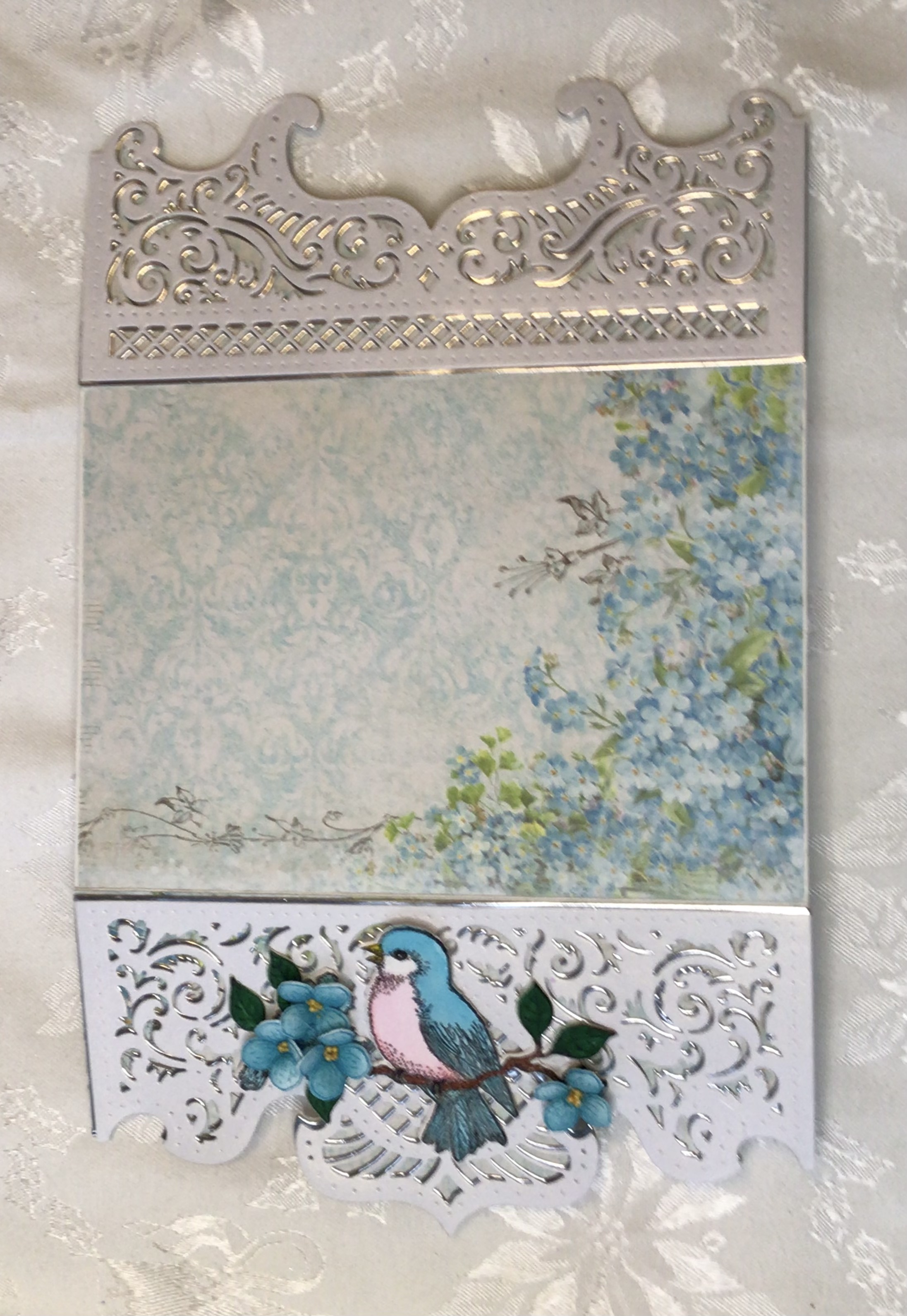 This lovely is created using Lemon Craft’s “Forget Me Not” papers, as well as Heartfelt Creations dies from the “Cascading Petals” (the bird & branch) and Hydrangeas from their Cottage Garden Hydrangea collection, as well as he “Fancy Flourish Boarder” die.