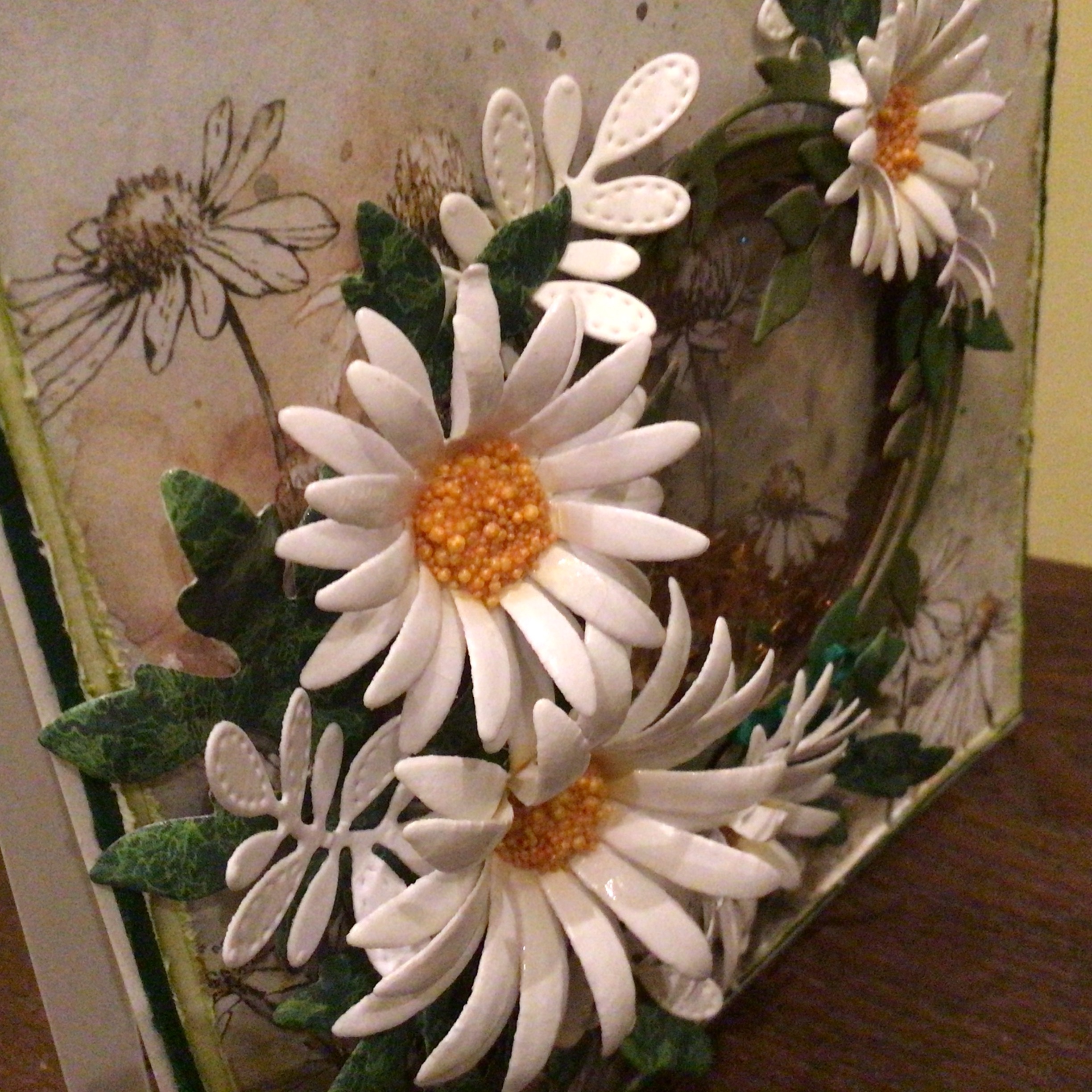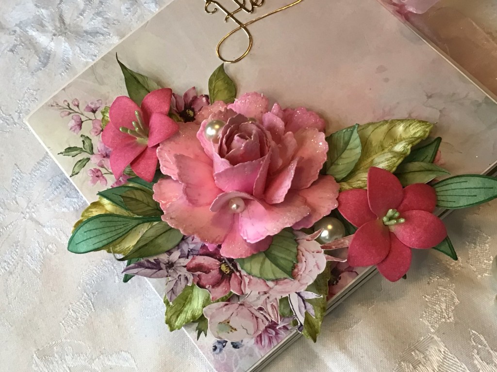 We used ScrapandMe’s paper, and a fancy heart shaped shaker box from Creative Embellishments (love that company!!) dies from Heartfelt Creations for the flowers, leaves and the the white lacy overlay, and the stamens. AND some tiny punched flowers and leaves in the corner there. This is just such fun to make, and stunning in presentation!