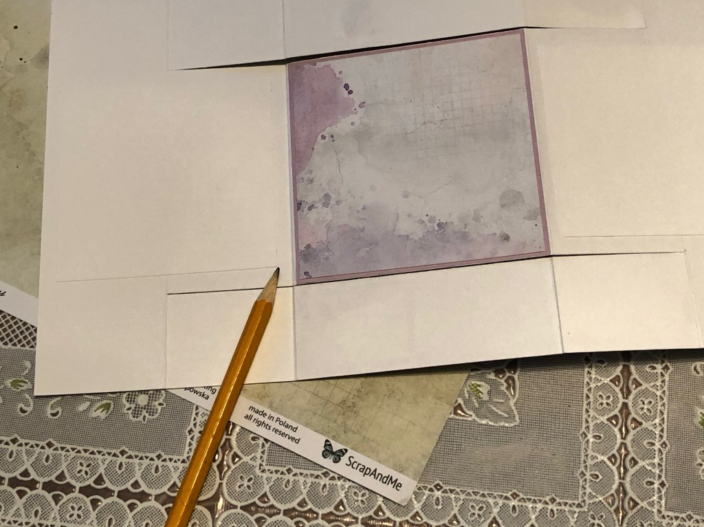 Right at the pencil tip, you can see the extra piece I placed to stiffen up that part of the card. That purple square on the back is for a personal message.