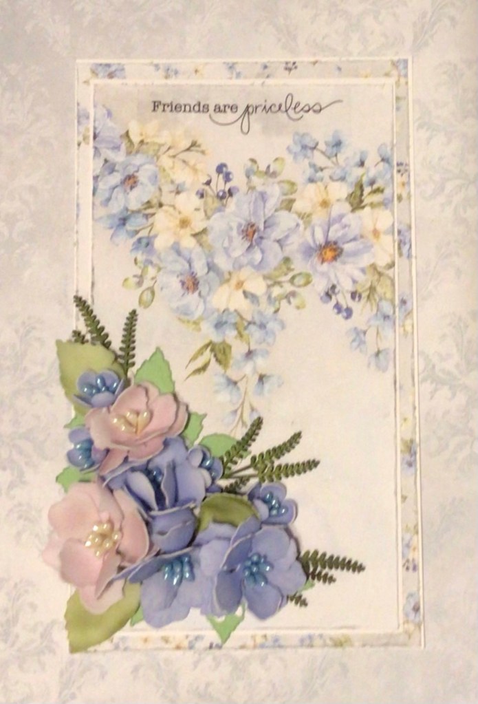 This lovely uses ScrapandmeSapphire Days paper, it is about 4-1/2” x 7-1/2”. The flowers are (Heartfelt Creations dies) cut out of fomiron, and the fern are actually thin little woodcuts, which I found from Little Birdie Crafts – they are primed when you receive them, and I just daubed them with a little ink.
