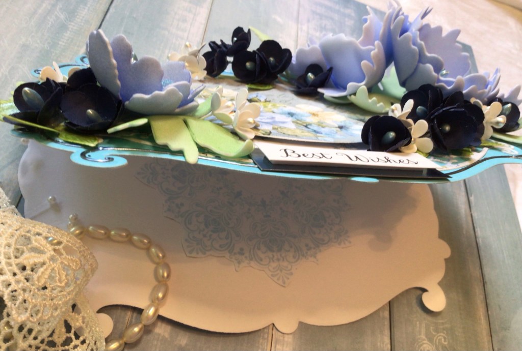 Once again, using many of my flower (and card) dies from Heartfelt Creations, the light periwinkle blue are made out of Fomiron, but the dark navy blue, and white blossom, are paper.