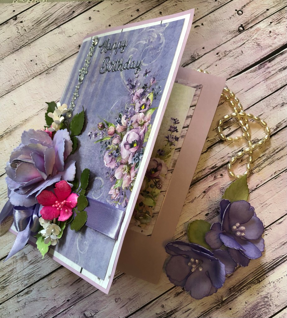 Here you see the card open and shut. Hope you enjoyed this mini tutorial – the making of this card was rather fun, and frankly, if you want to just fussy cut floral arrangements, instead of using dimensional flowers as I am wont to do, you could easily slip this in an envelope for mailing. Thanks so much for stopping by!