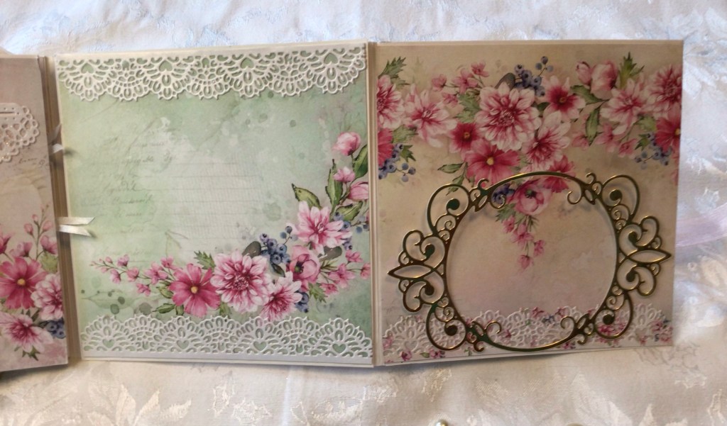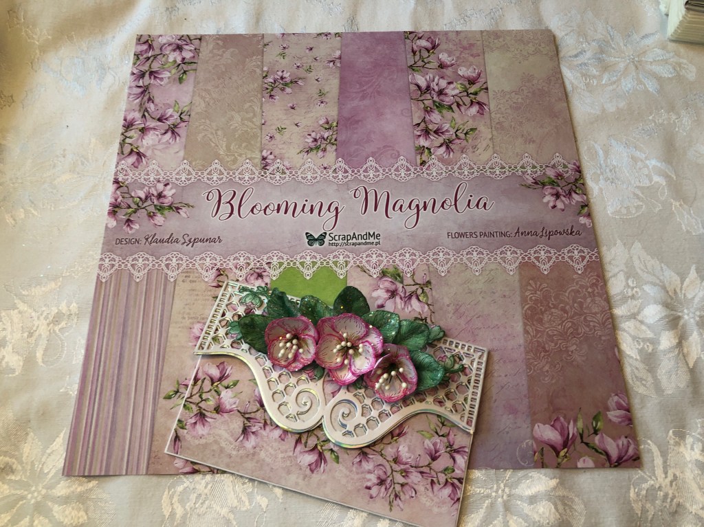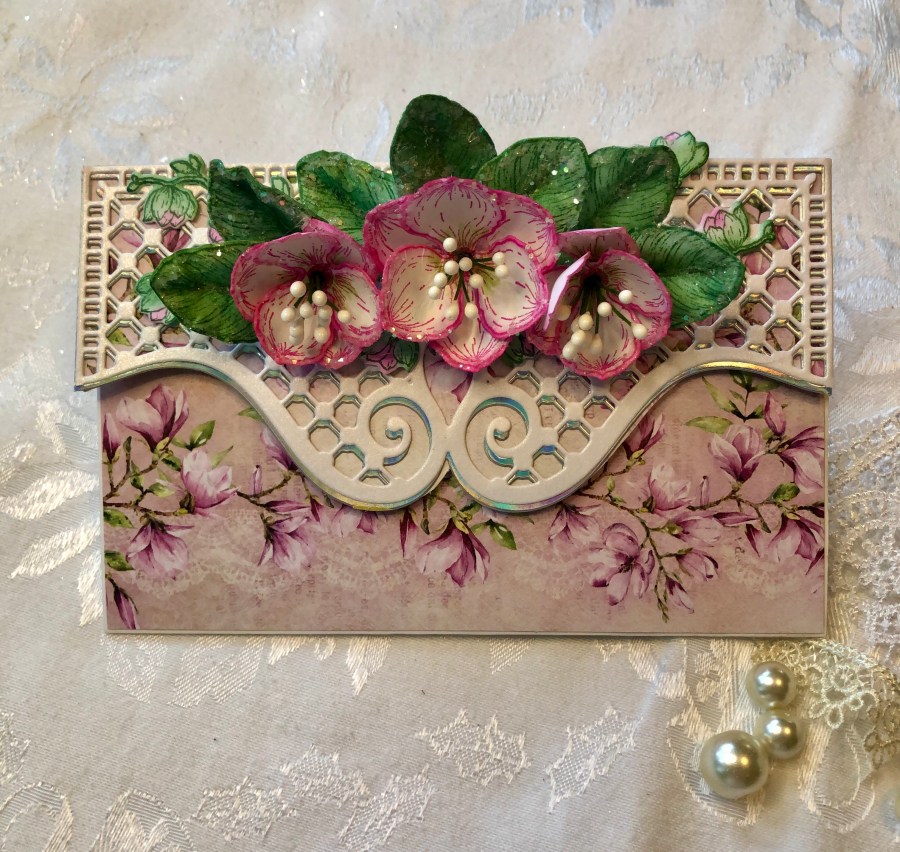 This lovely paper is from Scrapandme’s Blooming Magnolia. I have used a HFC die or two, for the lacy bits, and the Magnolias. This came together super easy with a 6 x 12 base, folded then Col erred with the decorative paper.
