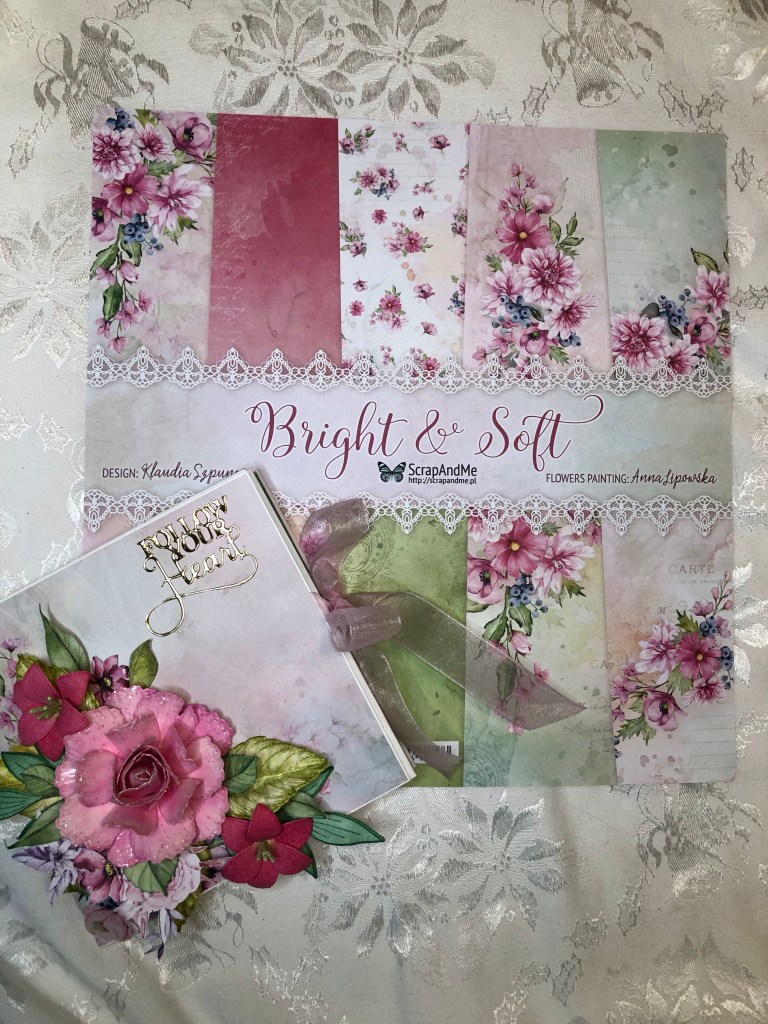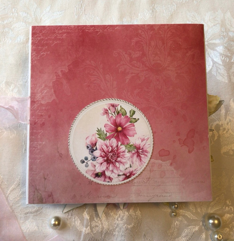 I was on a roll with Mini-Albums, so decided to copy my format with Scrapandme’s beautiful “Bright and Soft” papers. These have become my favorite papers, but they are difficult to obtain here in America. I got lucky on Etsy, and found some from someone in England & ordered two packs of four or five different collections, so I’ve got things to play with for a few weeks! (Actually, who are we kidding here? When I die, there will still be scrapbook paper in my crafty space!!)