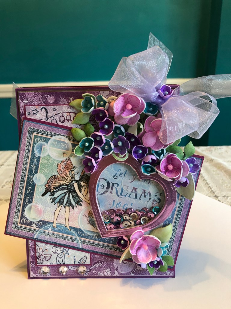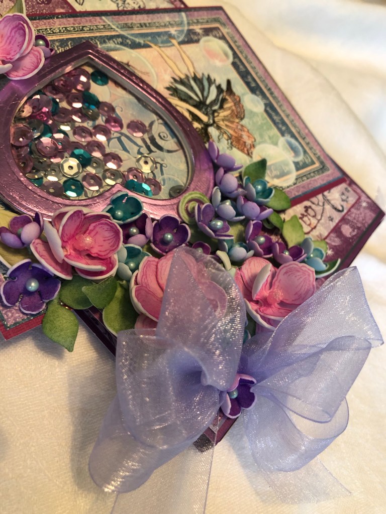And here is the front of my card. as you can see, the “ribbon” isn’t actually a ribbon at all, but I love it, and just had to have it!! (Wal-mart find, lol) Sentiment and shaker box kit are both from Creative Expressions, flowers made from Heartfelt Creations dies. The sparkle inside the shaker box came from Buttons Galore.