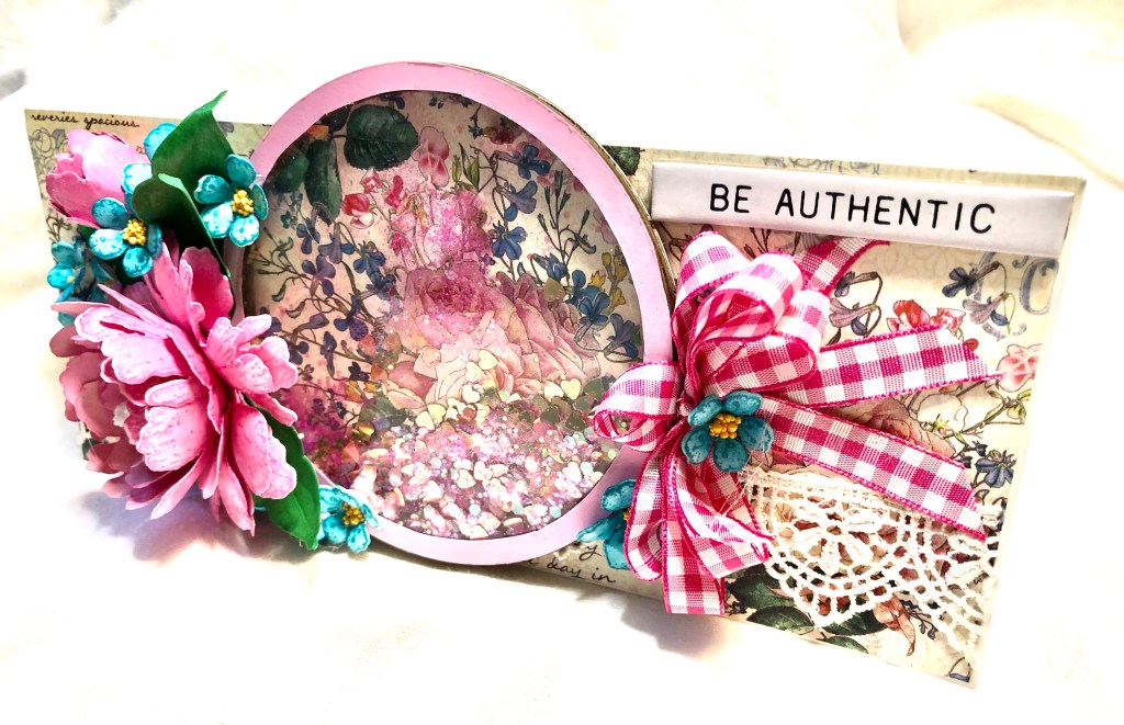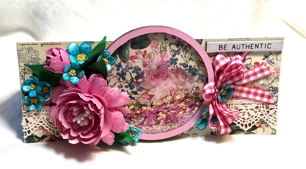 This card measures about 9” x 4”, and I selected papers from Ultimate Crafts Bohemian Bouquet, and created a shaker box to bring more attention to the featured image.