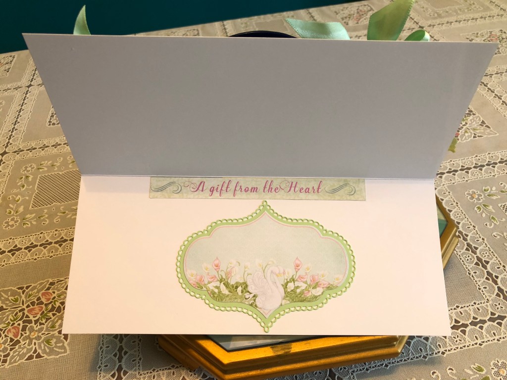 This is a very simple slim line card, measuring about 8” long, and 3-1/2” tall. The Calla Lilies are made from vellum, as are the leaves. The swans are die cut out from the Heartfelt Creations paper, and lifted up with some thick tape, to add a bit of dimension. The bows of course just add to the feminine appeal.